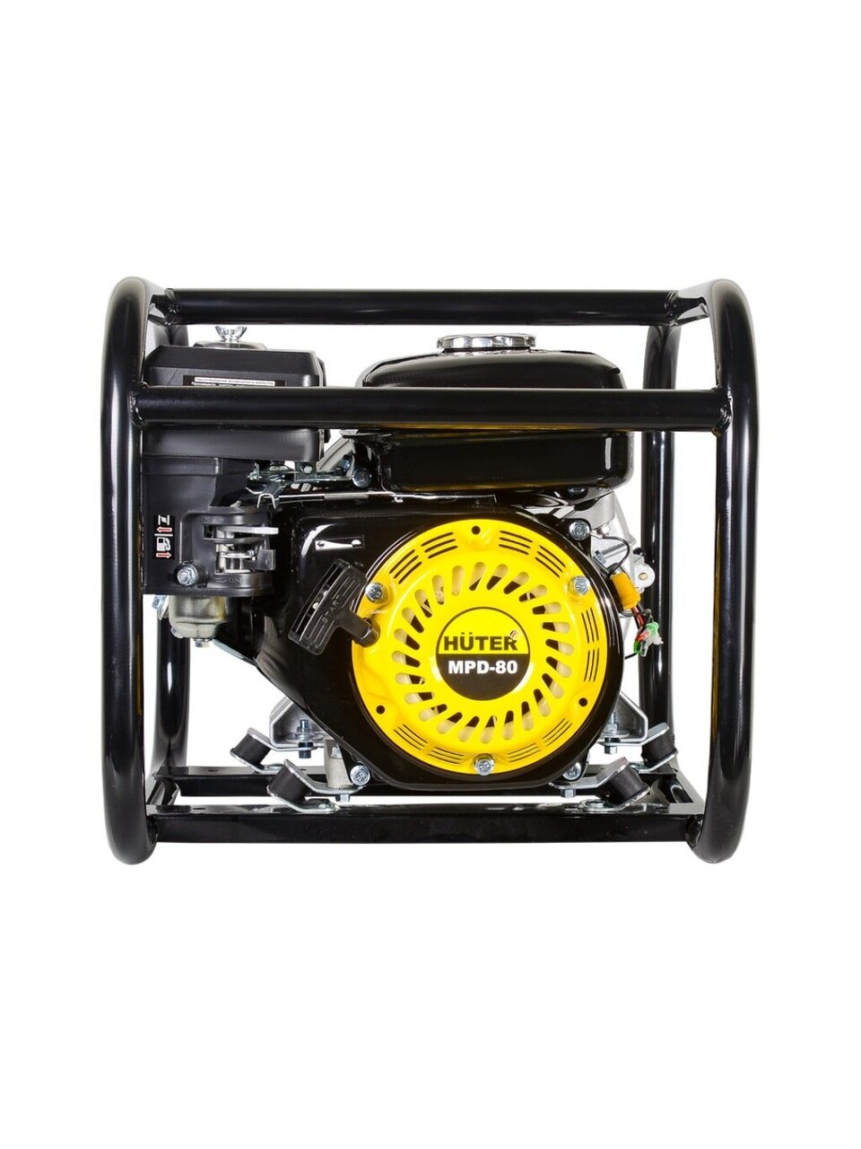 Центробежный насос Huter MPD-80 Функциональная часть мотопомпы представлена центробежным насосом самовсасывающего типа (не требуется предварительное заполнение водой всасывающей системы), способного, при номинальных оборотах в 3600 об/мин, перекачивать 900 л воды за минуту, поднимая её с глубины до 8 метров, создавая напор в 30 метров. Удобные прорезиненные шпильки позволяют легко, без инструмента, вскрыть корпус для очистки.