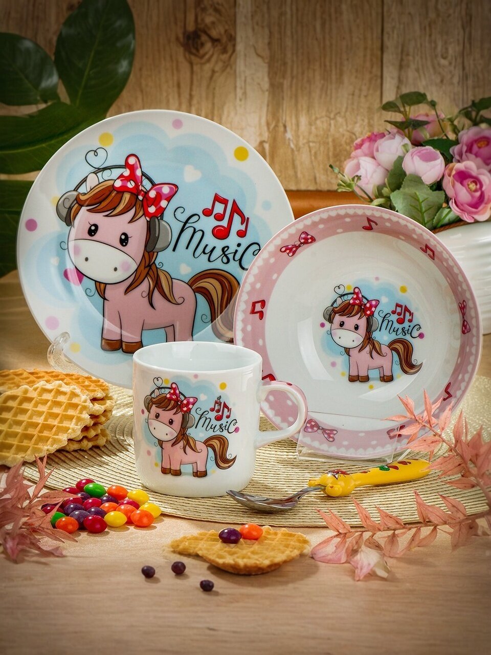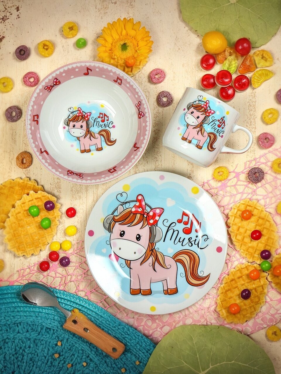 Предметы набора выполнены из высококачественной керамики и декорированы красочным рисунком. Изделия легкие и функциональные. Такой набор обязательно понравится вашему ребенку, потому что теперь у него будет своя собственная посуда с ярким и оригинальным рисунком. Набор посуды для детей включает в себя три предмета: суповую тарелку, обеденную тарелку и кружку. Набор упакован в красочную, подарочную упаковку.