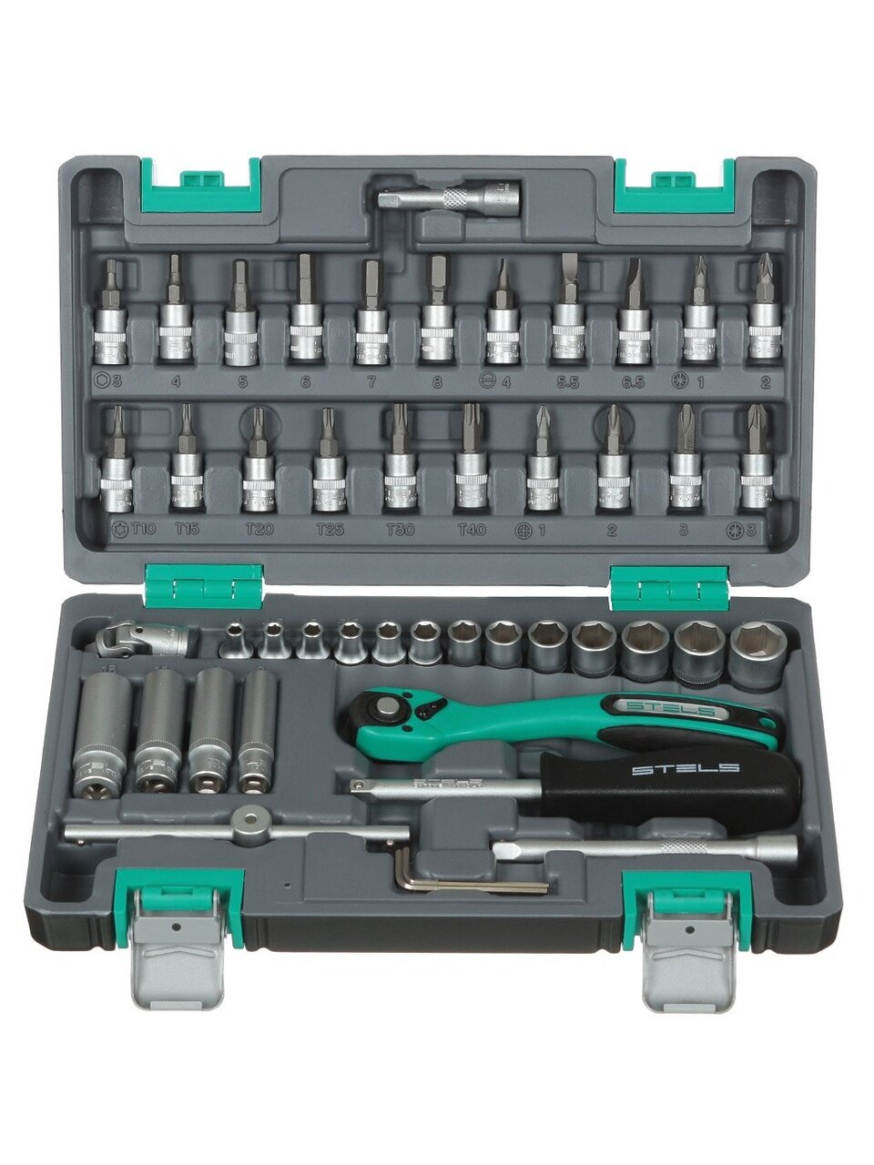 Наборы инструмента торговой марки STELS разработаны специально для автолюбителей и центров технического обслуживания. Каждый этап производства контролируется в соответствии с международными стандартами. Набор укомплектован масло и бензостойкой двухкомпонентной трещеткой. Головки и комбинированные ключи изготовлены из хромованадиевой стали, придающей инструменту исключительную твердость в сочетании с легкостью. Биты, биты-вставки и отвёртки производятся из стали S2, улучшающей свойства инструмента. Все наборы упакованы в кейс, изготовленный из жесткого противоударного пластика, с металлическими застёжками. Наборы инструмента STELS пригодятся вам не только в автомобиле. С их помощью можно проводить бытовой ремонт дома и на даче, ремонт бытовых конструкций и садовой техники.