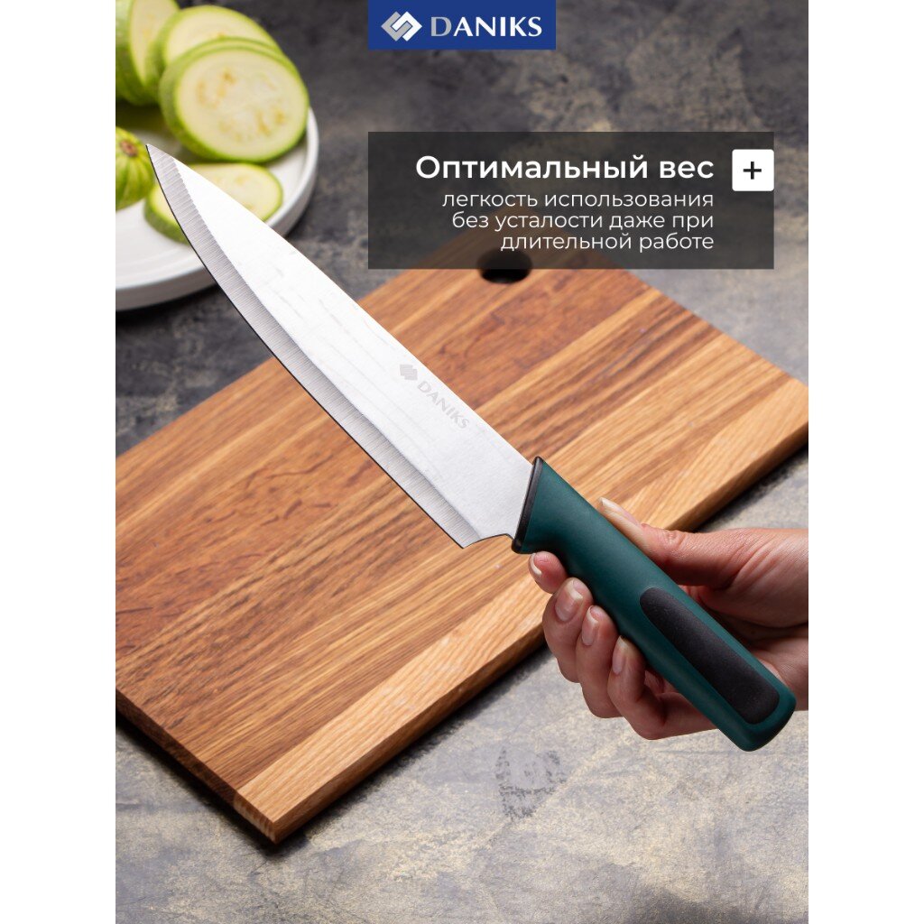 Daniks Emerald – это выбор для тех, кто ценит качество, удобство и современный внешний вид кухонных аксессуаров. Благодаря возможности мыть ножи в посудомоечной машине уход за комплектом становится максимально простым, а прочные материалы гарантируют сохранение внешнего вида и функциональности на долгие годы. Оптимальная длина лезвий (от 9 до 20 см) позволяет легко справляться с любыми задачами – от нарезки овощей до разделки мяса и хлеба. Яркий зелёный цвет поднимает настроение и делает процесс приготовления пищи ещё приятнее.