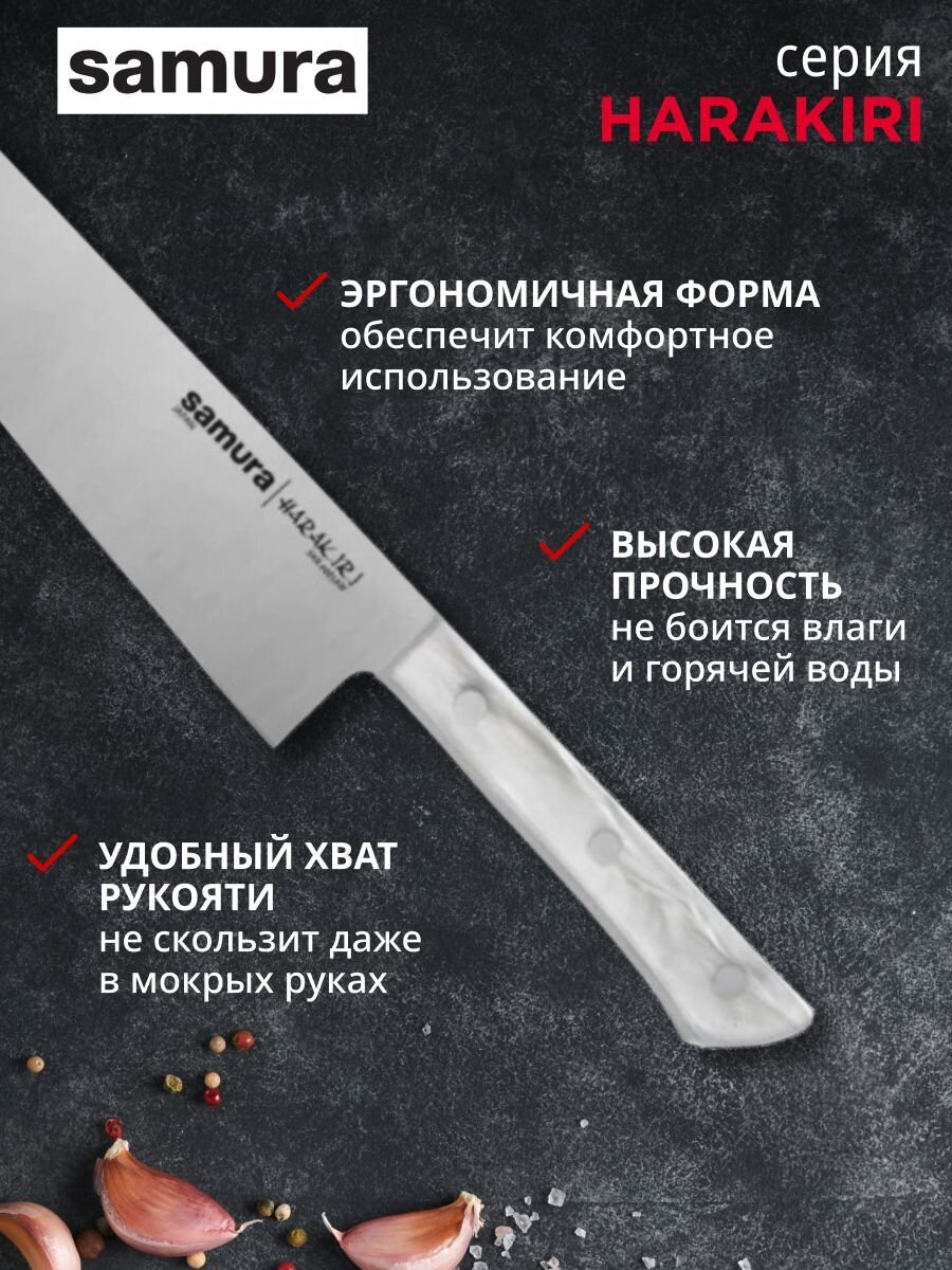 Ножи Samura Harakiri — это выбор тех, кто ценит качество, функциональность и стиль. Серебристый цвет придаёт современный вид, а цельнометаллическая конструкция обеспечивает прочность и устойчивость к износу. Благодаря продуманному балансу и надежной фиксации рукоятки ножи удобно лежат в руке, что повышает эффективность работы и снижает усталость.