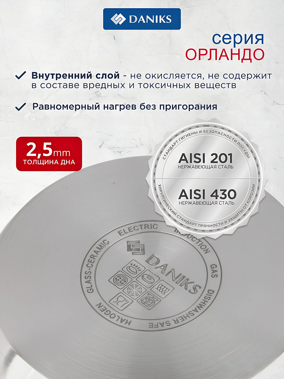 Как выбрать набор посуды для индукционной плиты? Daniks Орландо — это оптимальное сочетание цены и функциональности. В наборе — кастрюли разных объёмов и ковш, что позволяет готовить суп, кашу, макароны или пюре для семьи любого размера. Сталь 201 марки прочна и устойчива к деформации, а стеклянные крышки с клапаном обеспечивают контроль за процессом приготовления.