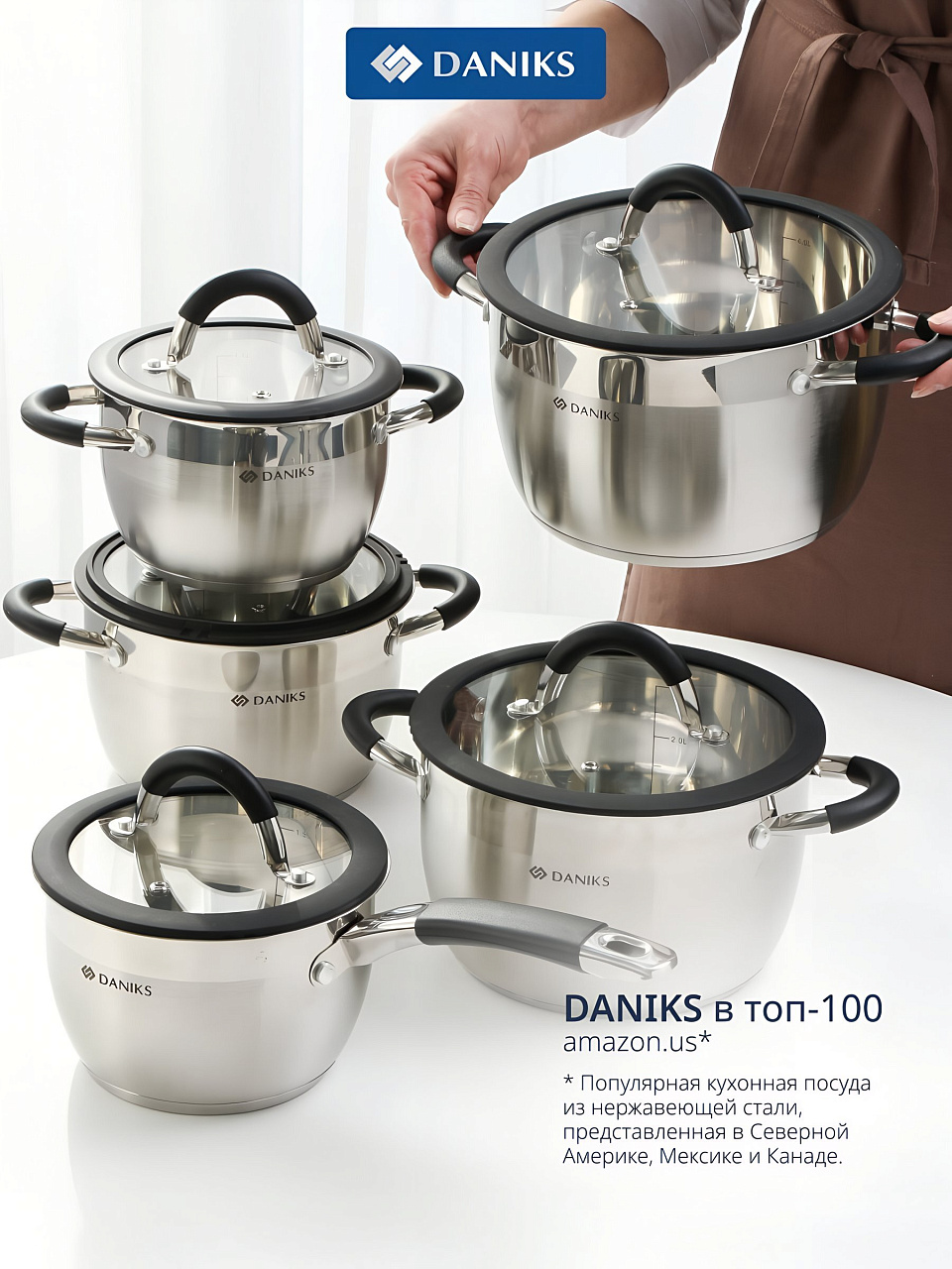 Набор посуды из нержавеющей стали Daniks Орландо 10 предметов: универсальное решение для кухни, дачи и подарка — долговечность, совместимость с индукцией, стеклянные крышки.