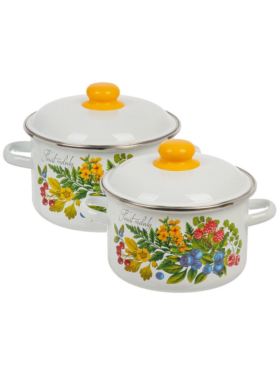 В набор входят две кастрюли объёмом 3 и 4 литра, обе с металлическими крышками. Цвет — белый, модель «Лесная мелодия», артикул 1KB431M.