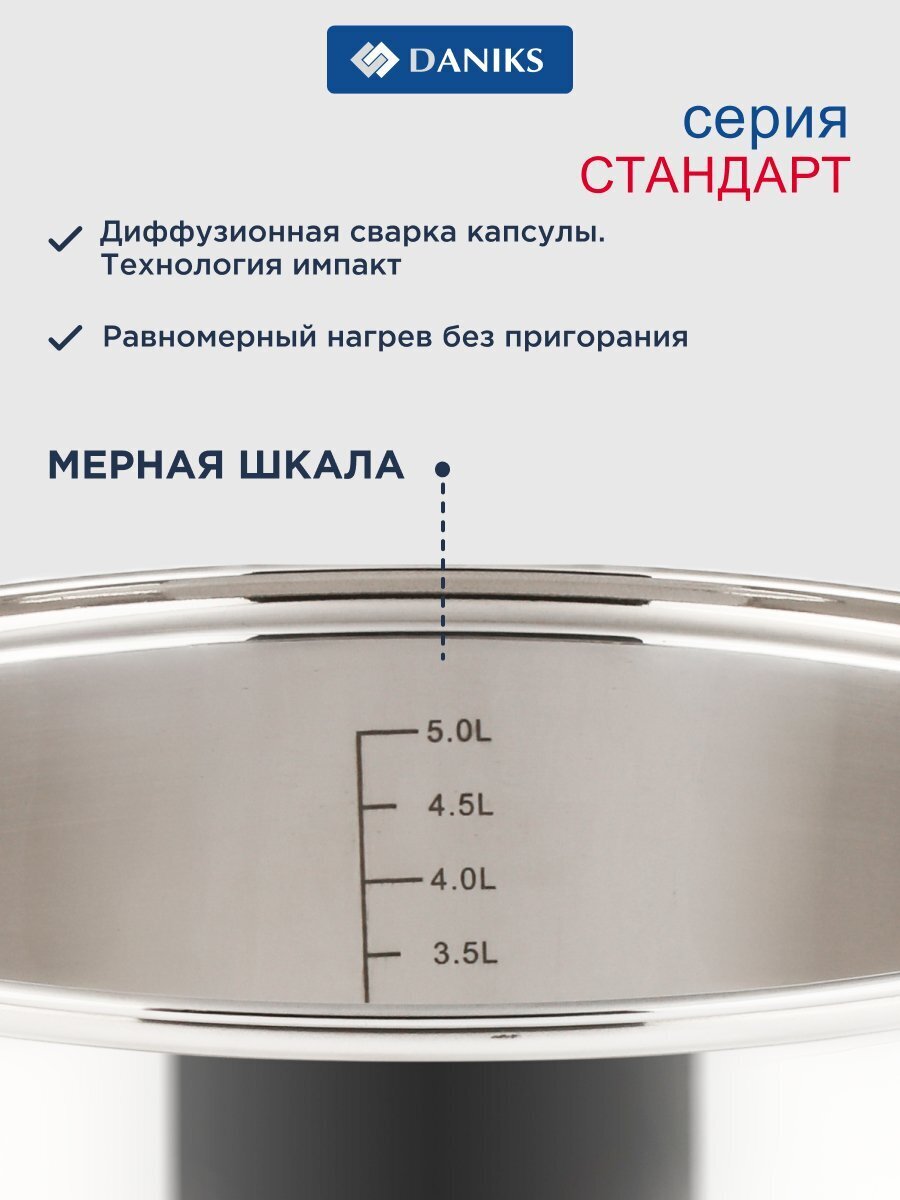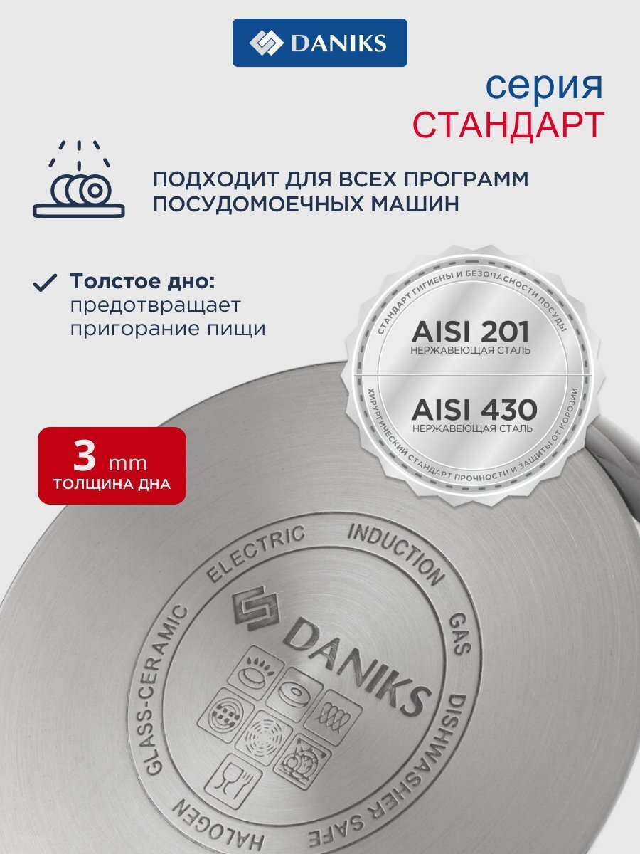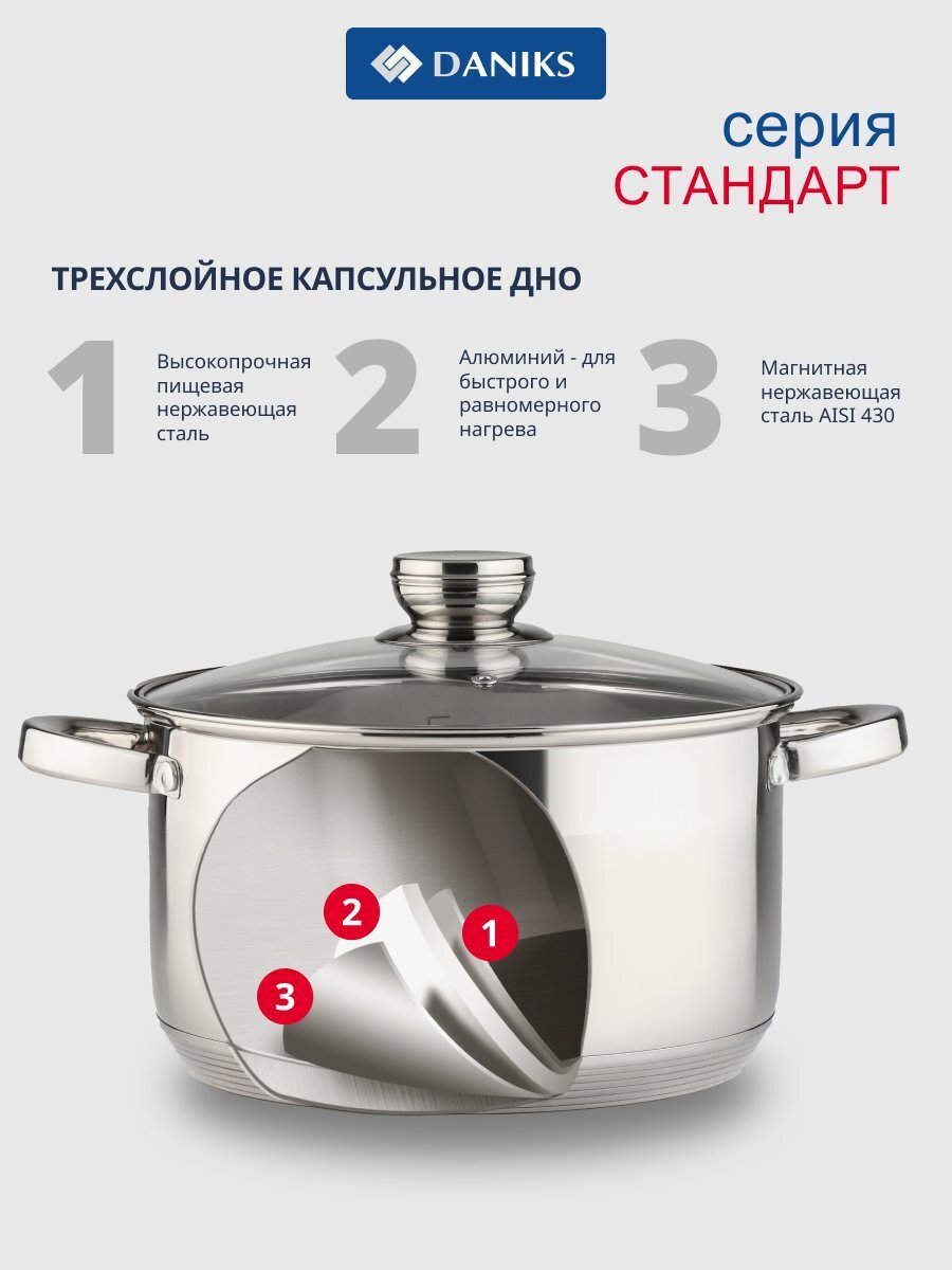 Набор посуды Daniks Стандарт PR — это оптимальный выбор для тех, кто ищет, какую посуду купить для индукционной плиты или как выбрать кастрюли для дома и дачи. Все кастрюли изготовлены из устойчивой к коррозии нержавеющей стали, что обеспечивает долгий срок службы и простоту ухода. Прозрачные крышки из закалённого стекла позволяют контролировать процесс приготовления без потери тепла и пара.
