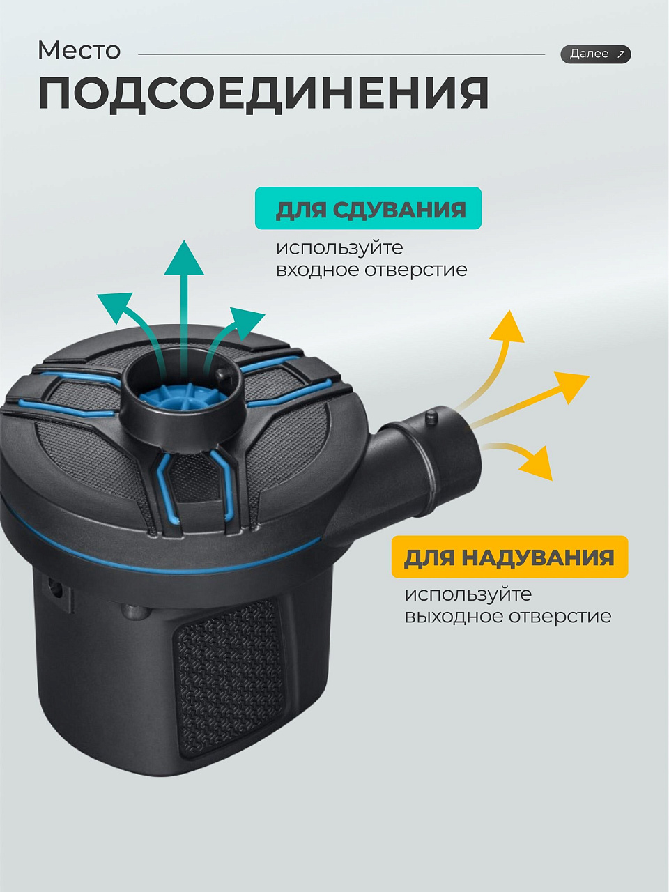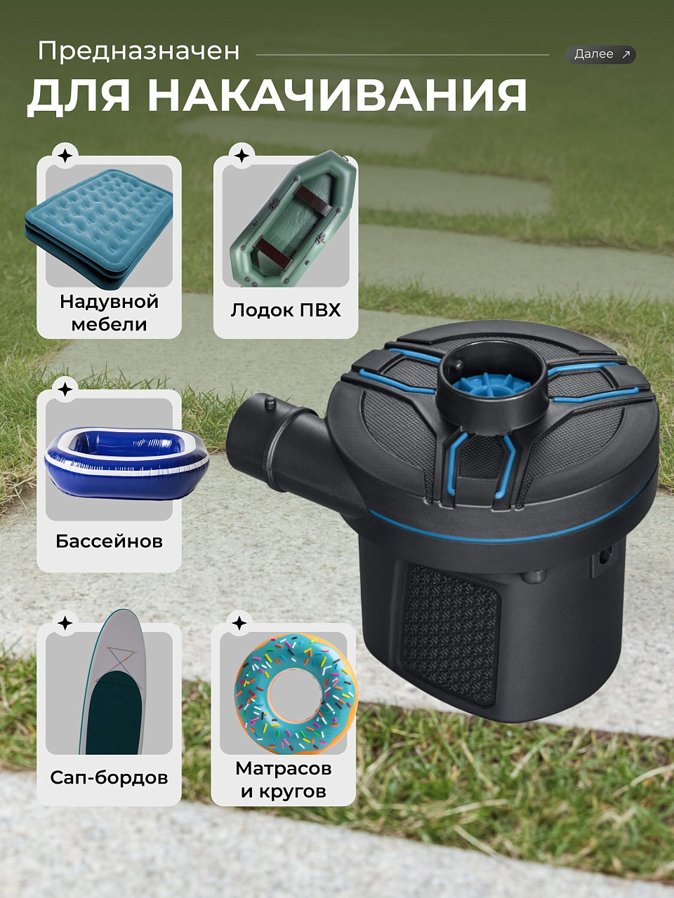 Насос воздушный - это удобный и практичный инструмент для накачивания различных предметов, таких как матрасы, надувные кровати, игрушки, коврики для кемпинга, плотики и многое другое.