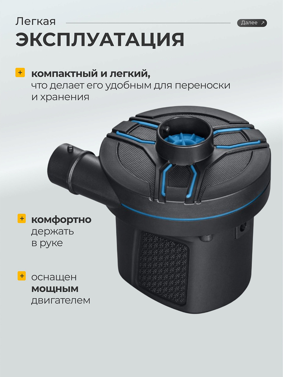 - Оснащен мощным двигателем, который обеспечивает быстрое и эффективное накачивание, сокращая время и усилия, которые Вы тратите на этот процесс.