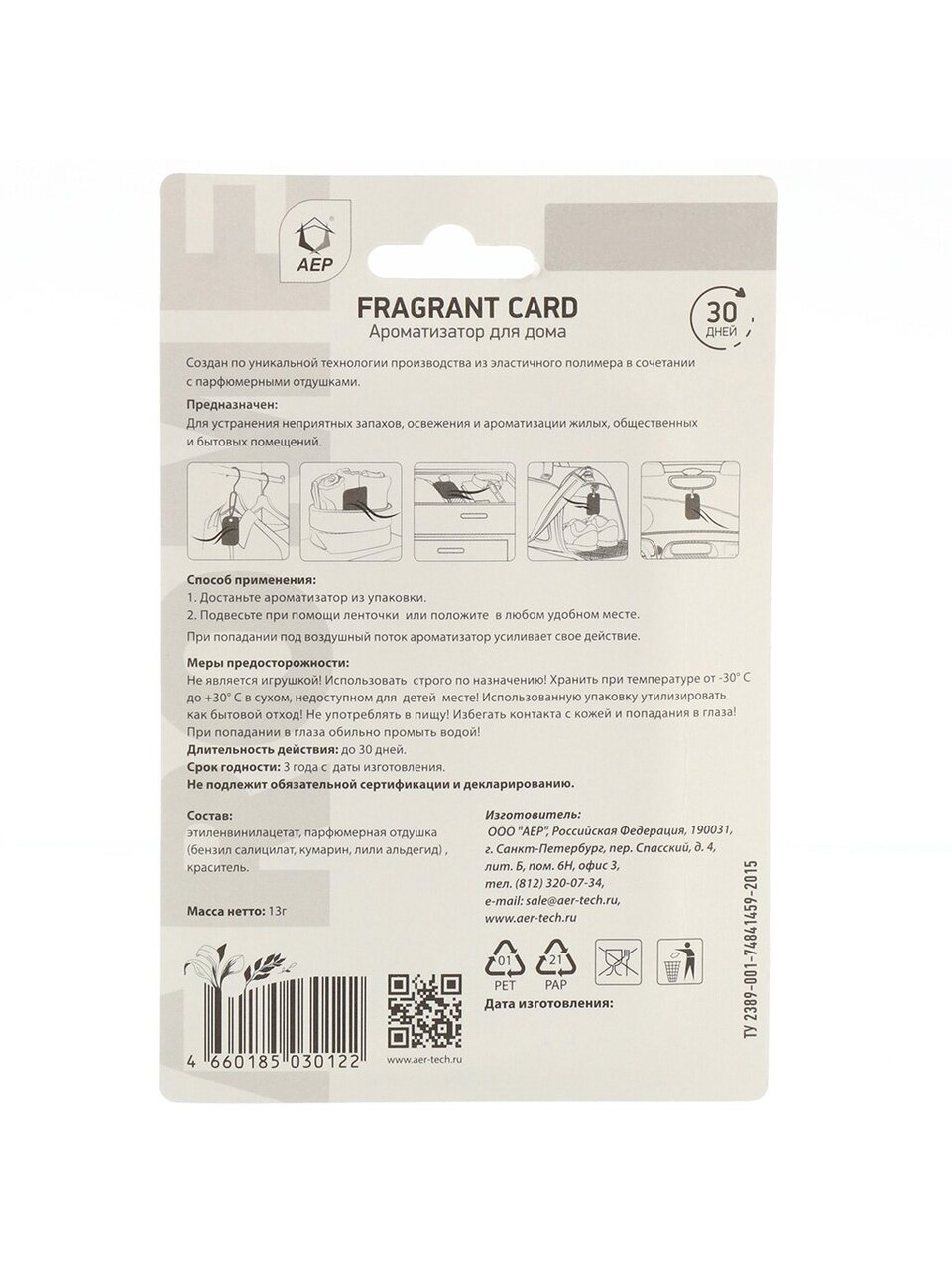 Ароматизатор Fragrant Card отлично подходит для ароматизации малых пространств: комод с бельем, шкаф с вещами, сумка, автомобиль и т.д. Наполнит дом приятными и изысканными ароматами. Если вам не хватает положительных эмоций и хорошего настроения, аромат Dark amber - точно то, что вам нужно!