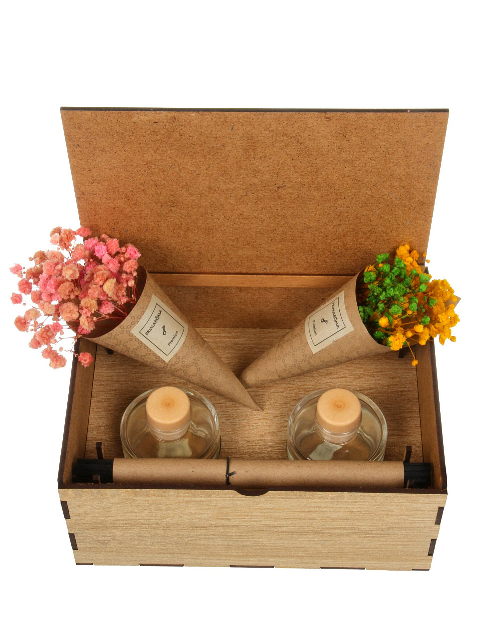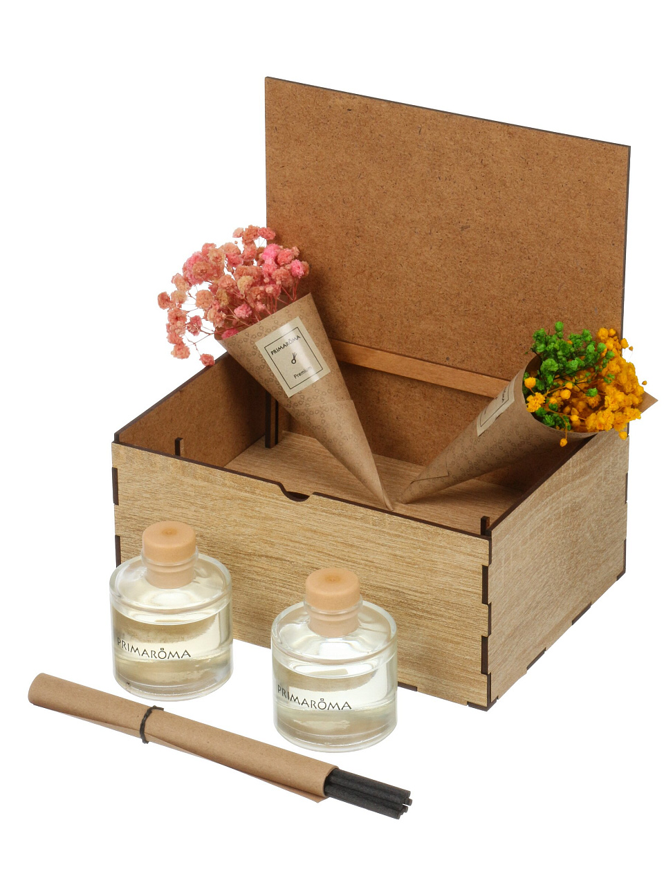 Аромадиффузор 2 в 1 Primaroma Flore "Весенний сад" и Flore Свежесть апельсина, ананаса и зелени в стильном деревянном футляре для дома и офиса.