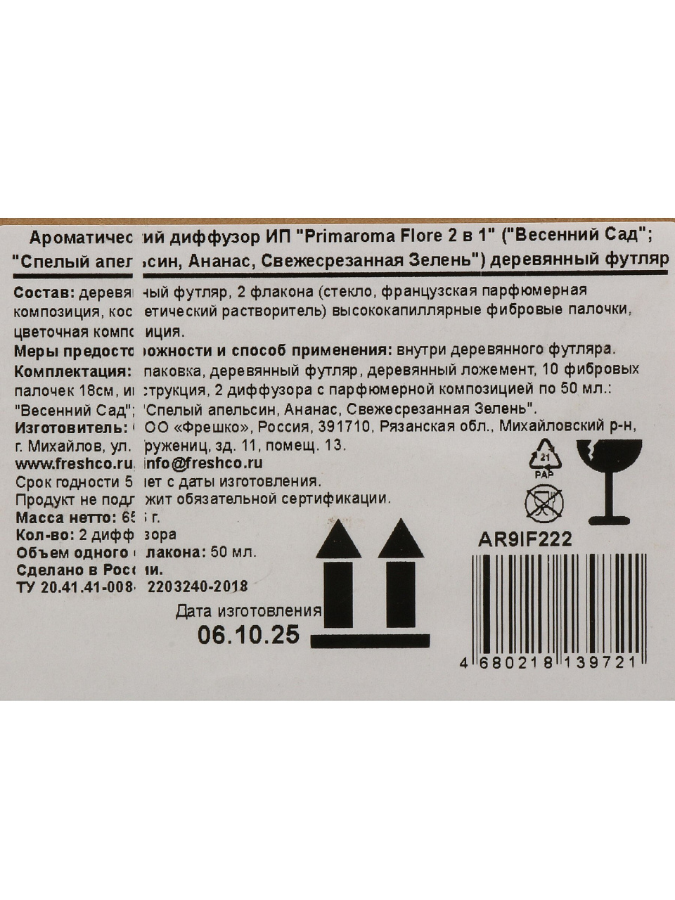 Вы можете приобрести «Аромадиффузор Primaroma, 50 мл, 656 г, Flore Весенний сад, Апельсин, Ананас, Зелень, 2 в 1, деревянный футляр, AR9IF222» и другие товары в нашем интернет-магазине в Воронеже по низким ценам и с бесплатным самовывозом.