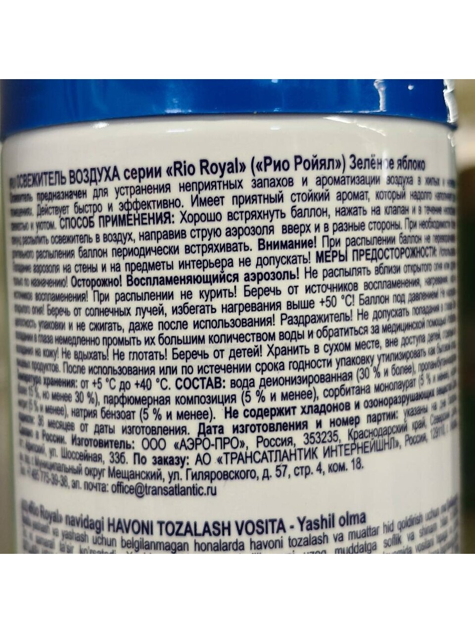 Освежитель воздуха Rio Royal «Зеленое яблоко» предназначен для устранения неприятных запахов в различных помещениях. Он надолго наполняет пространство приятным ароматом. Аэрозоль не содержит озоноразрушающих веществ.