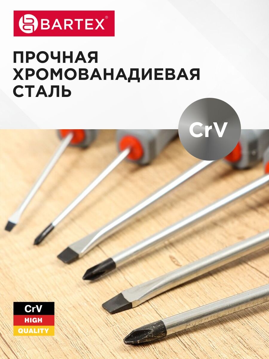 Набор отверток Bartex — надежный инструмент для домашних работ и ремонта. Антискользящая двухкомпонентная ручка обеспечивает комфорт и уверенное удержание даже при длительном использовании. Прочные стержни из CrV стали с магнитными свойствами гарантируют долговечность и удобство при работе с крепежом. Компактный комплект включает отвертки с крестовым и плоским наконечником, что делает его универсальным выбором для дома и дачи.