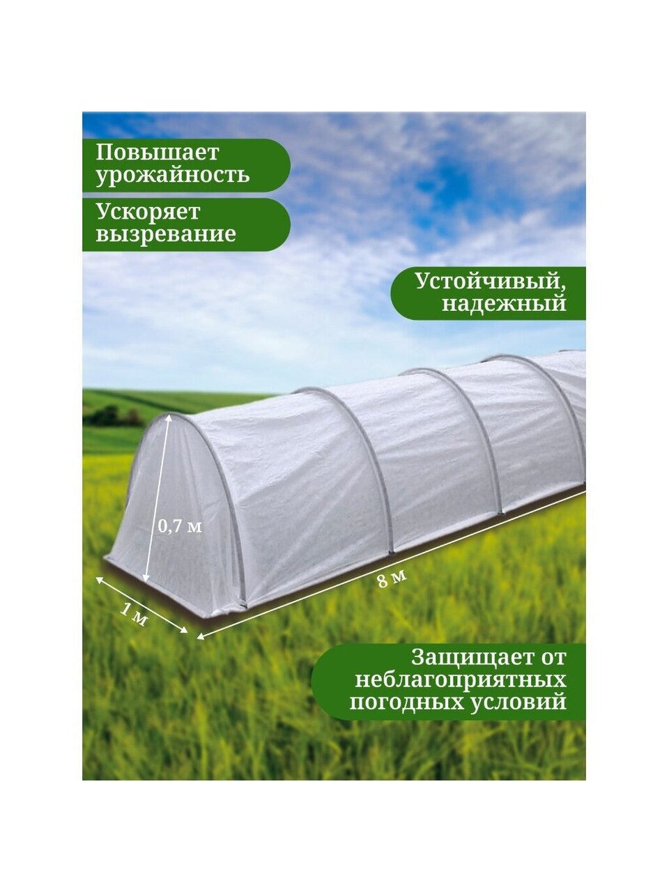 Парник размером 1х8х0.7 м изготовлен из спанбонда плотностью 42 г/м2, который защищает растения от резких перепадов температуры и вредителей, сохраняя при этом необходимую влажность. Каркас из пластика с длиной дуги 2.5 м и диаметром трубы 16 мм обеспечивает прочность и устойчивость конструкции. Этот парник идеально подходит для использования на даче или в огороде, позволяя эффективно использовать пространство и обеспечивать растениям комфортные условия.