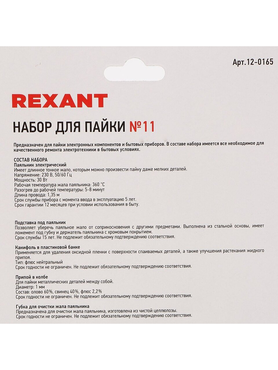 Компактный и легкий набор Rexant №11 легко хранить и транспортировать, его удобно брать с собой на дачу или использовать в домашних условиях. Все аксессуары для пайки уже включены в комплект, что позволяет сразу приступить к работе без необходимости покупать дополнительные расходные материалы. Гарантия производителя 12 месяцев подчеркивает надежность и высокое качество продукции Rexant.