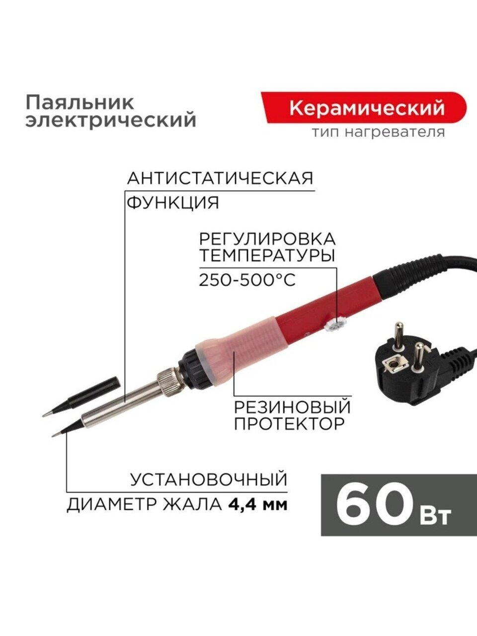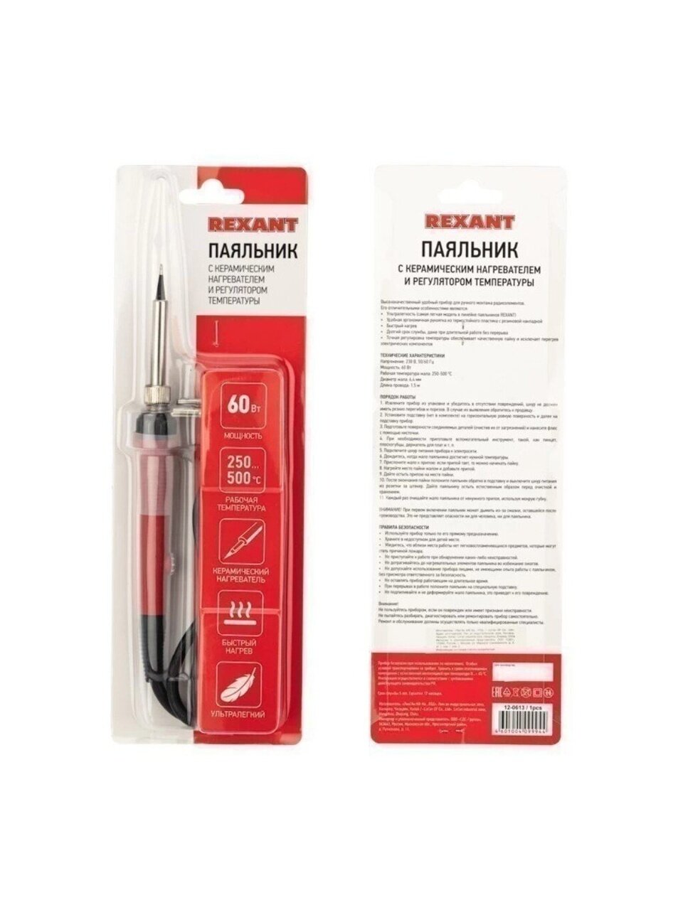 Паяльник сетевой 60 Вт, 230 В, с запасным жалом, керамическим нагревателем и регулировкой температуры — современное решение для качественной пайки дома и на даче. Продукт бренда Rexant, модель Japan type, создан для тех, кто ценит надежность, безопасность и удобство в работе с электроникой, ремонтом и творчеством. Благодаря керамическому нагревателю паяльник быстро достигает рабочей температуры, а регулируемая температура жала от 250 до 500 градусов позволяет подобрать оптимальный режим для различных задач — от пайки мелких деталей до работы с массивными элементами.