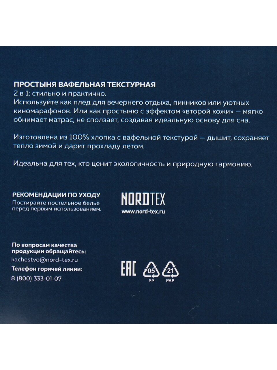 Вафельная ткань из 100% хлопка обеспечивает мягкость, воздухопроницаемость и приятные тактильные ощущения. Натуральный материал отлично впитывает влагу и быстро сохнет, что особенно важно для поддержания свежести и гигиеничности спального места. Плотность 210 г/м2 гарантирует прочность и долговечность, позволяя сохранять форму и привлекательный внешний вид даже после многочисленных стирок.