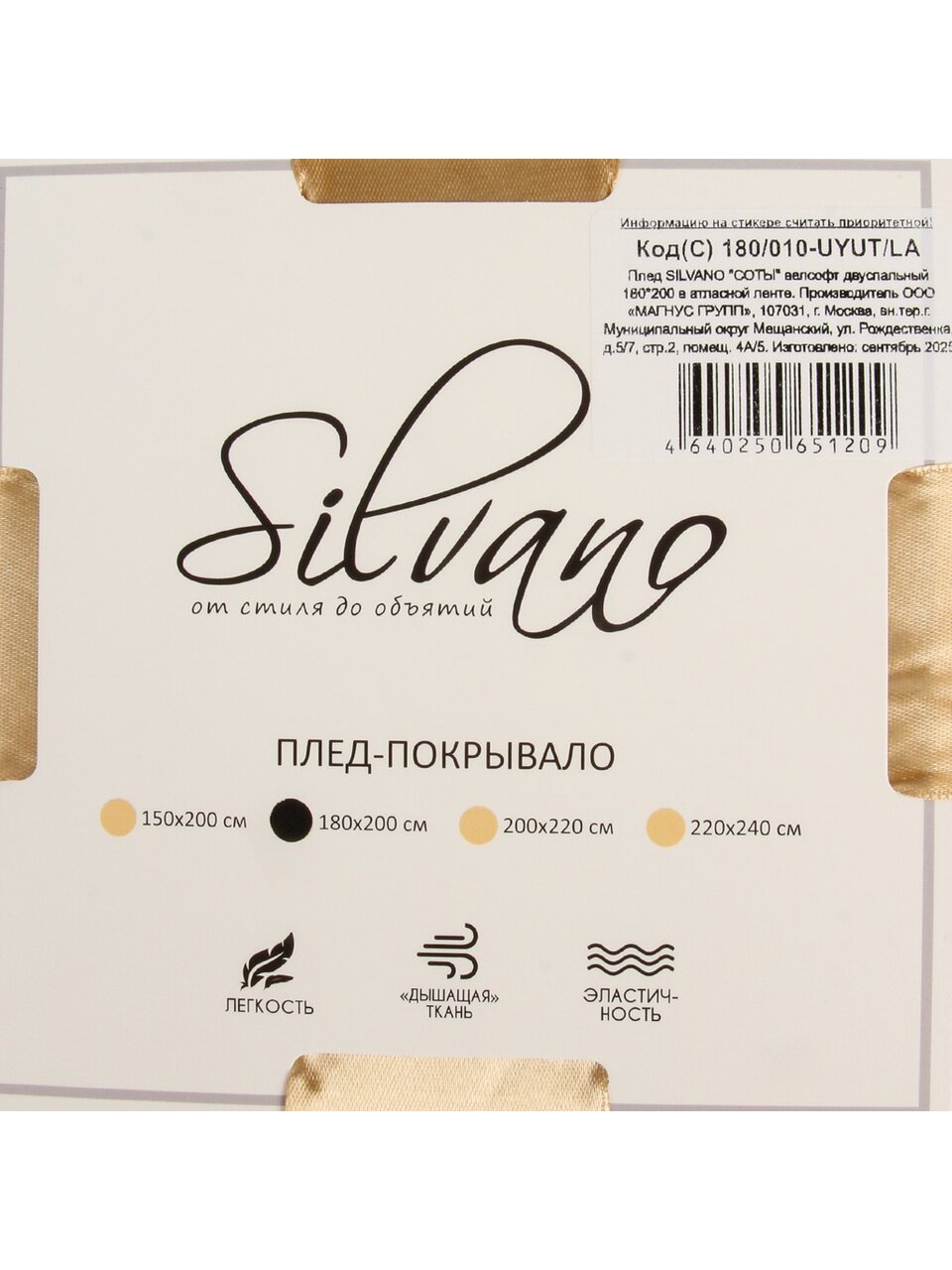 Размер пледа — 180х200 см, что идеально для стандартной двуспальной кровати или большого дивана.