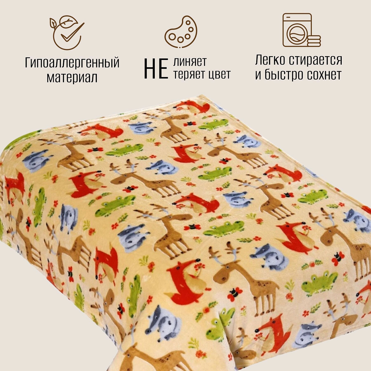Если вы ищете, какой плед лучше выбрать для подарка или для дачи, обратите внимание на этот вариант — он лёгкий (0,43 кг), компактный и занимает минимум места. Благодаря яркому рисунку и приятному бежевому оттенку, изделие впишется в любой интерьер детской комнаты.