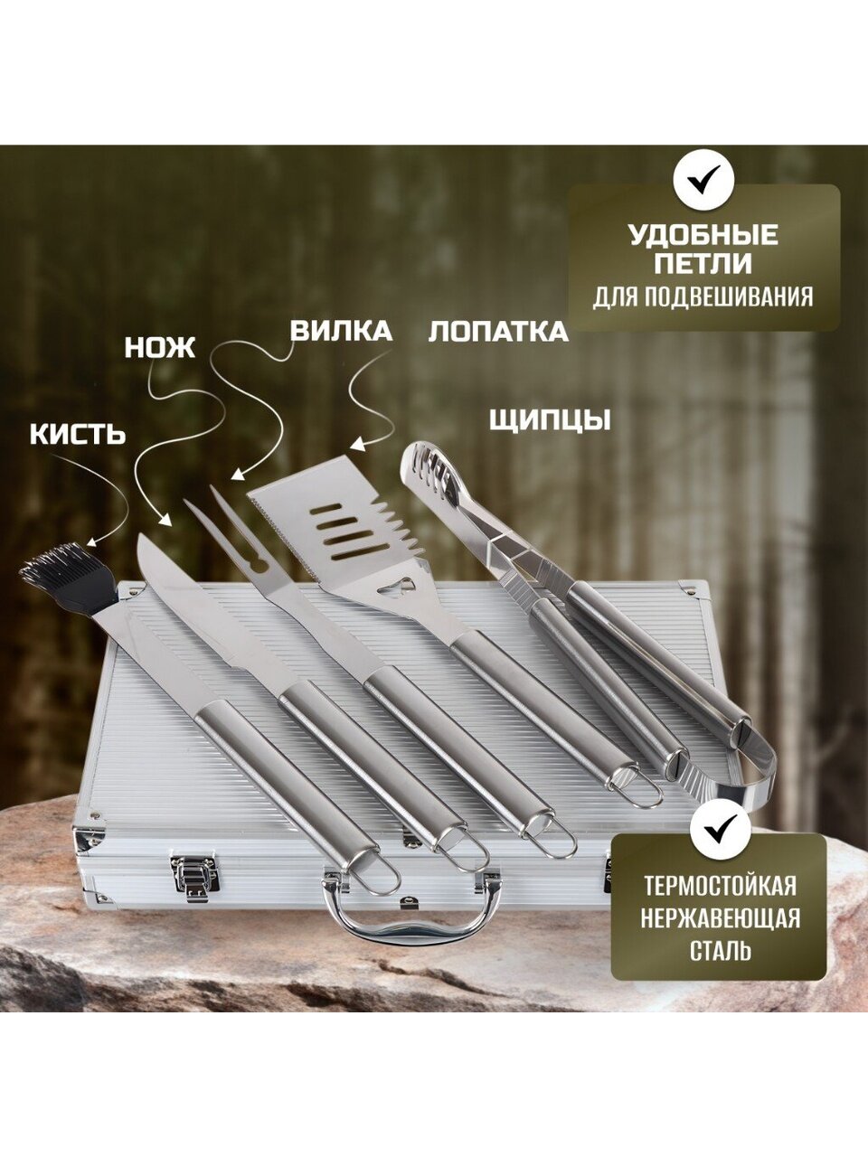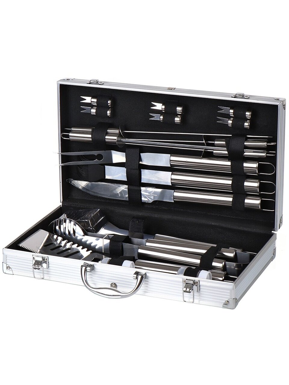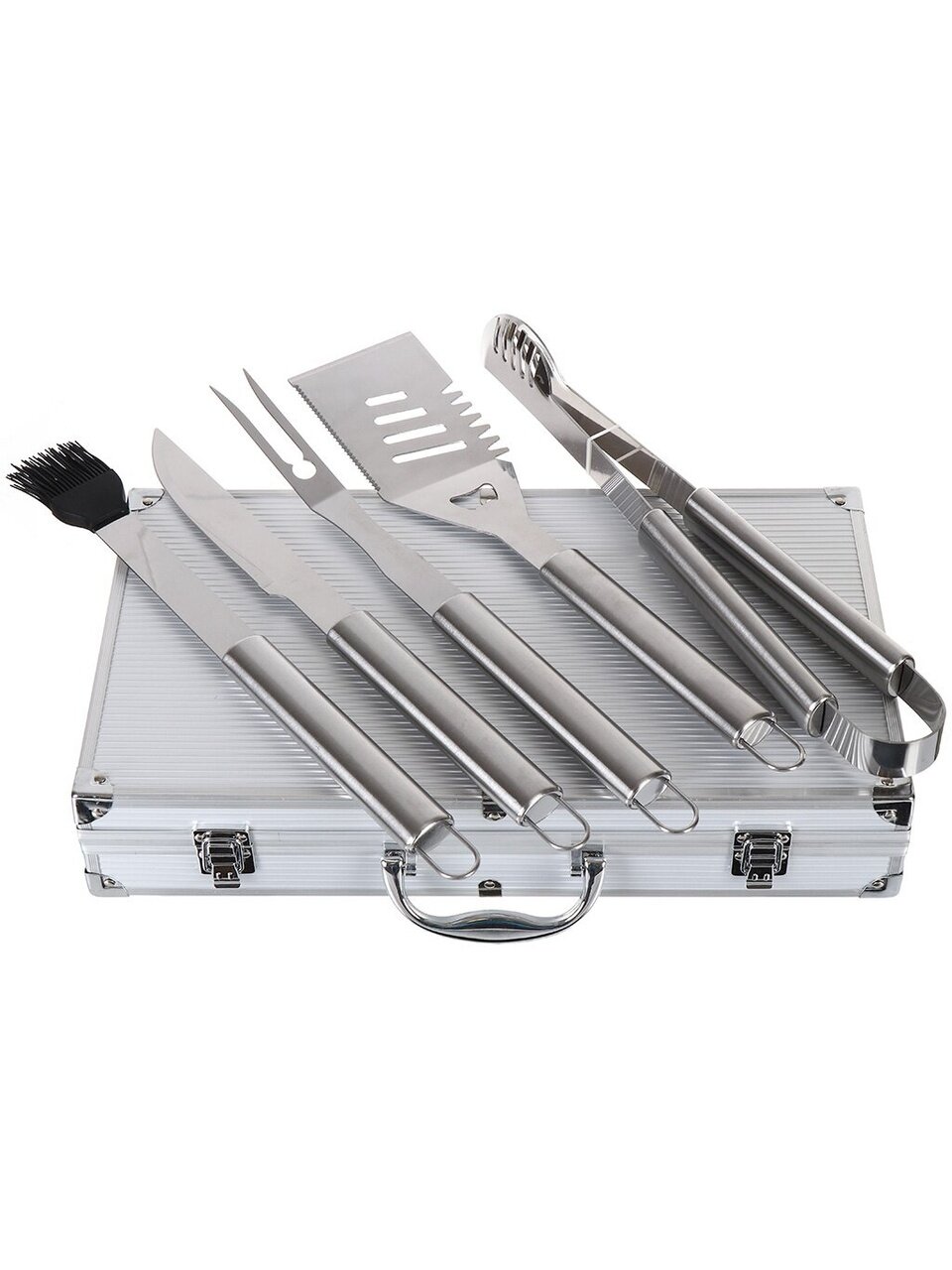 - Серебристый цвет придаёт набору для барбекю элегантность и современность, что делает его идеальным для любого пикника или вечеринки на открытом воздухе.