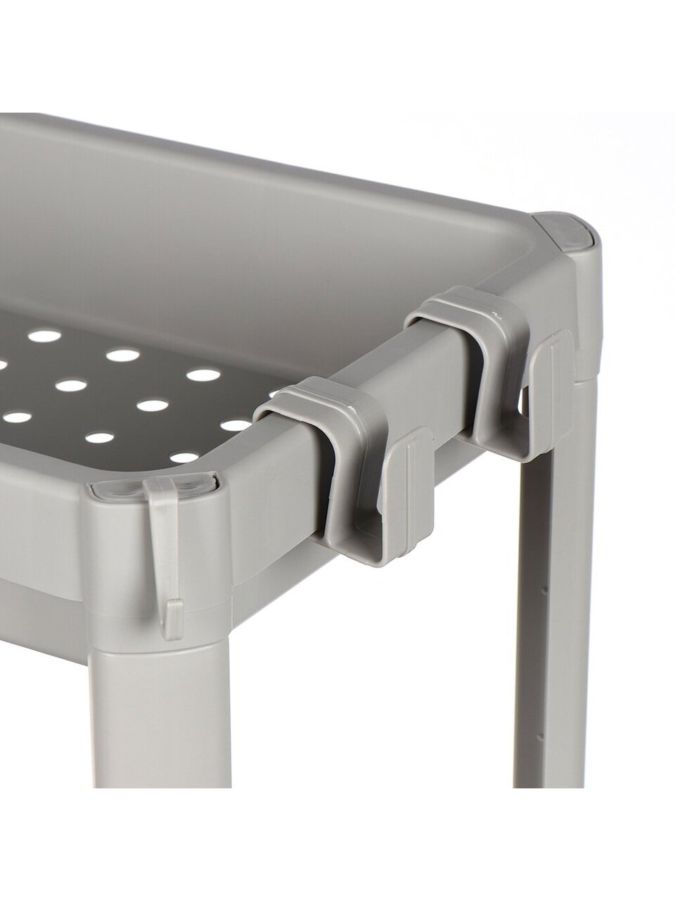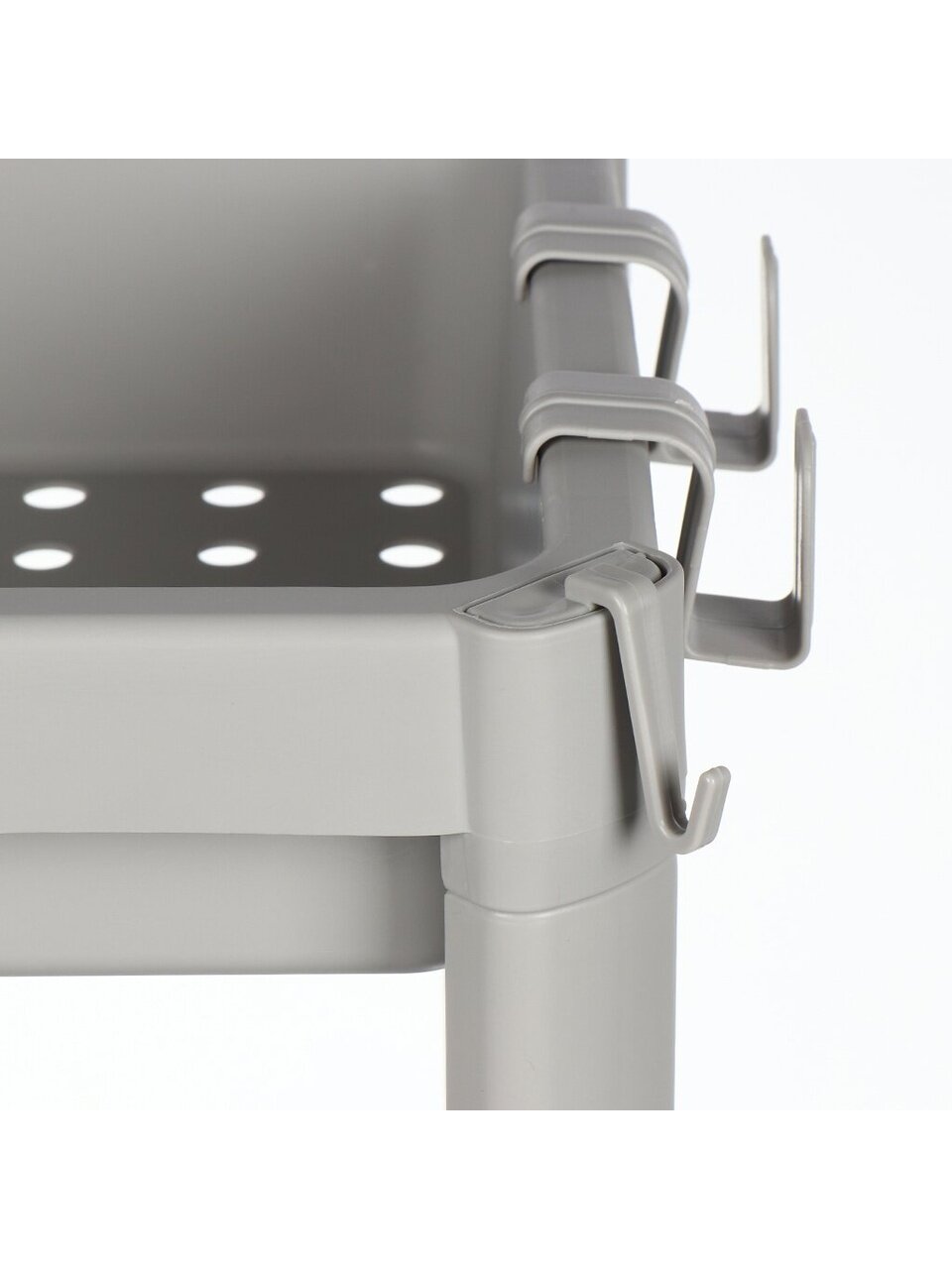 - Этажерка подходит не только для хранения банок, тюбиков, текстильных изделий, но и для размещения овощей и фруктов. Перфорированное дно полок создаст оптимальную циркуляцию воздуха.