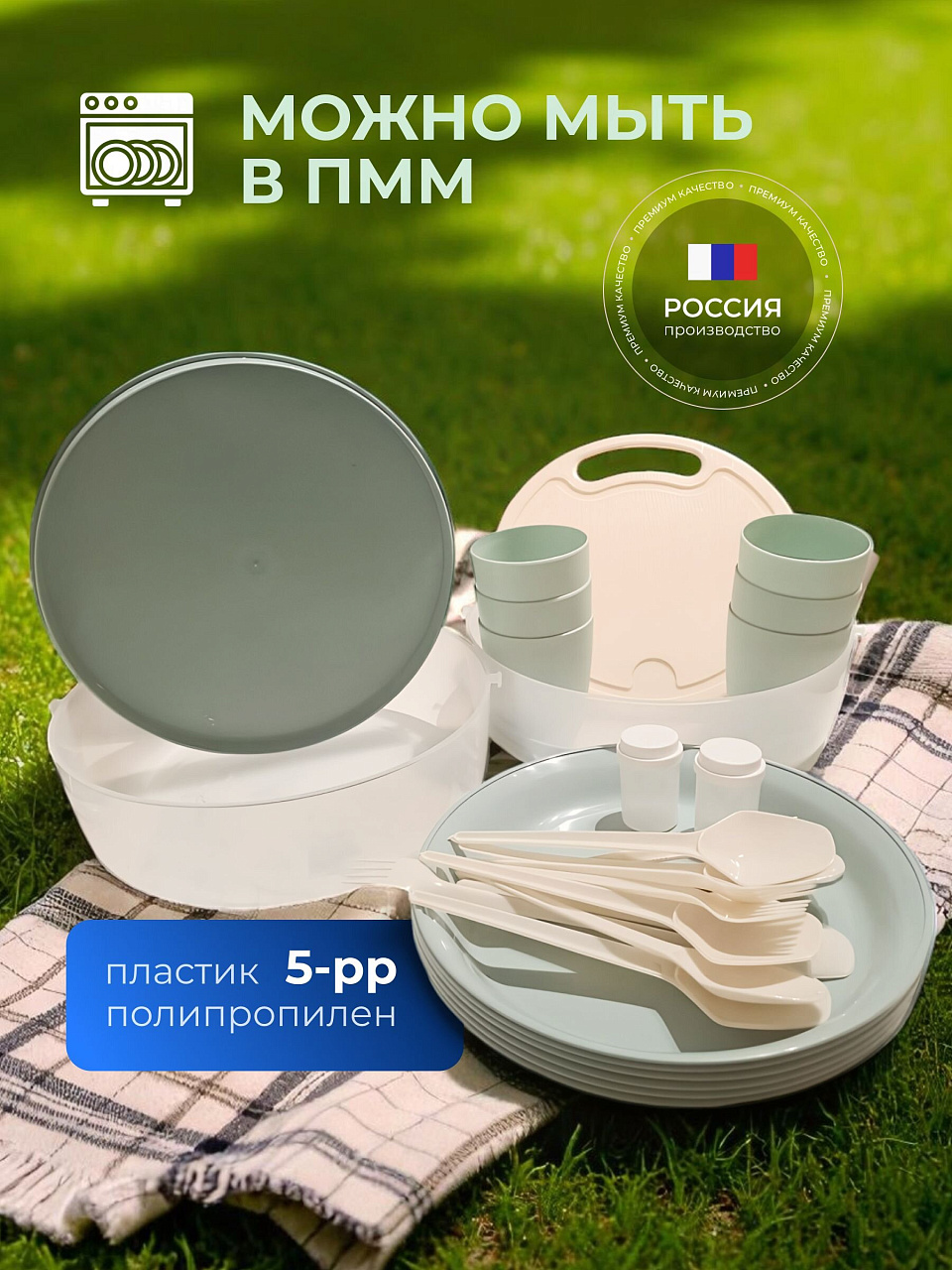 - Вся посуда свободно помещается в контейнер, который имеет ручку для удобства переноски.