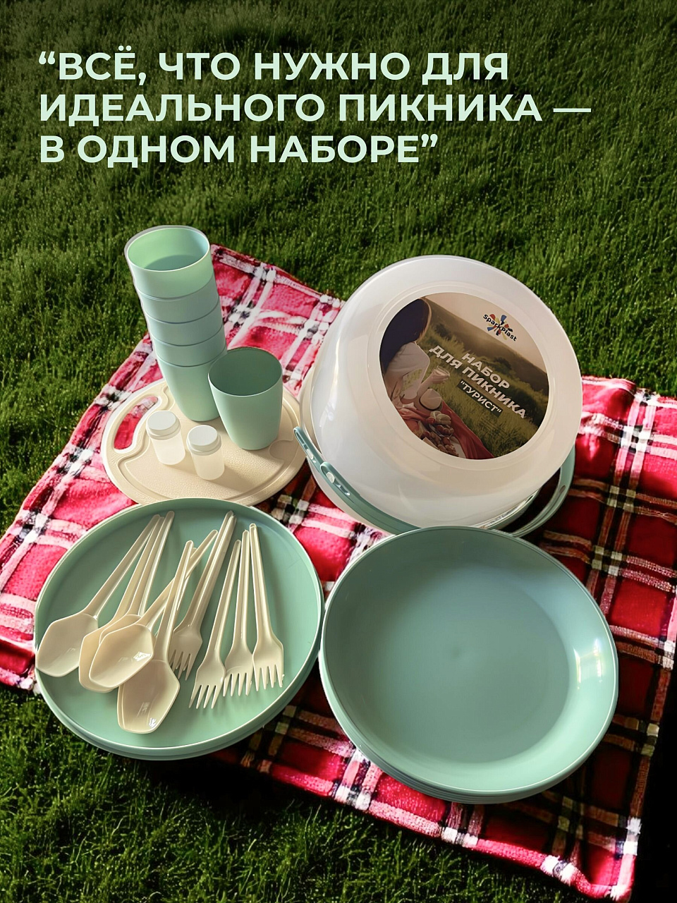 Настала теплая пора и вы уже мечтаете пойти на природу и приготовить вкуснейшие шашлыки, но встал вопрос, какую посуду взять с собой? Тогда вам просто необходим набор пластиковой посуды Турист в удобном кейсе с ручкой для переноски из 30 предметов, который станет неотъемлимым спутником для похода на пикник, шашлыки, поездку на дачу, либо просто на природу. В комплекте есть все необходимое для того, чтобы накрыть стол на 6 человек: тарелки, вилки, ложки, стаканчики, солонка, разделочная доска - вам останется положить свой любимый кухонный нож, и вы полностью готовы к приему пищи на свежем воздухе!