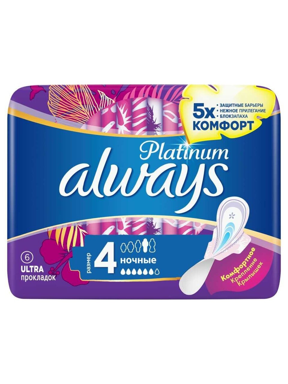 Гигиенические прокладки Always Platinum Ultra Night (размер 4) обеспечивают повышенный комфорт и усиленную защиту (по сравнению с Always Ultra). Гигиенические прокладки Always Platinum с 1000 мягких микроподушечек, действующих подобно боковым барьерам, и усовершенствованным центральным слоем обеспечивают лучшую защиту и комфорт от Always.
