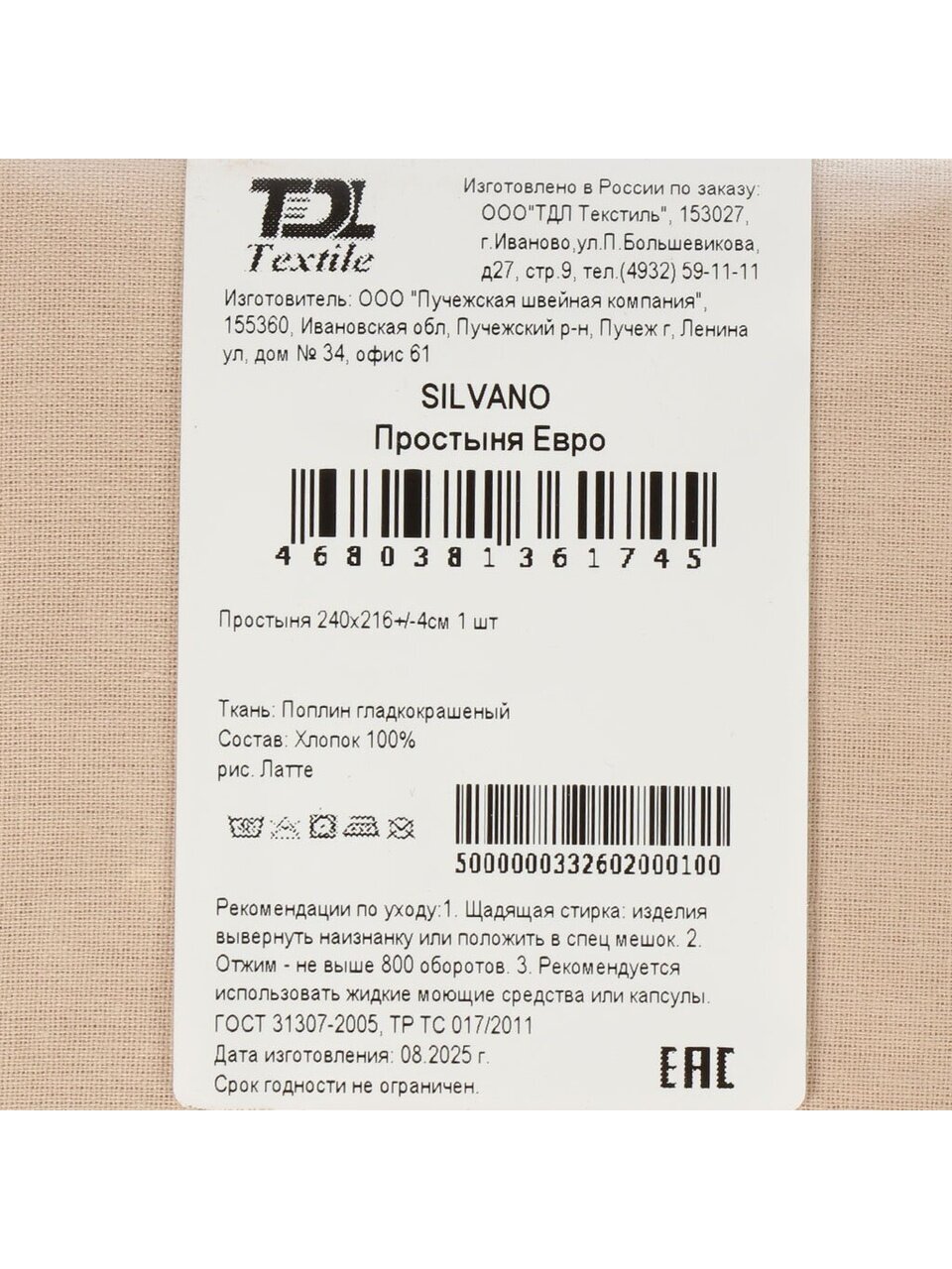 Простыня евро Silvano Латте 216×240 см — 100% хлопок поплин, долговечность и комфорт для спокойного сна по доступной цене.