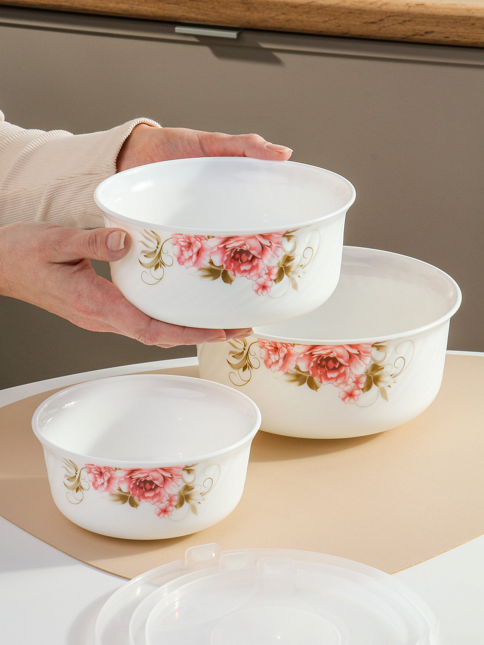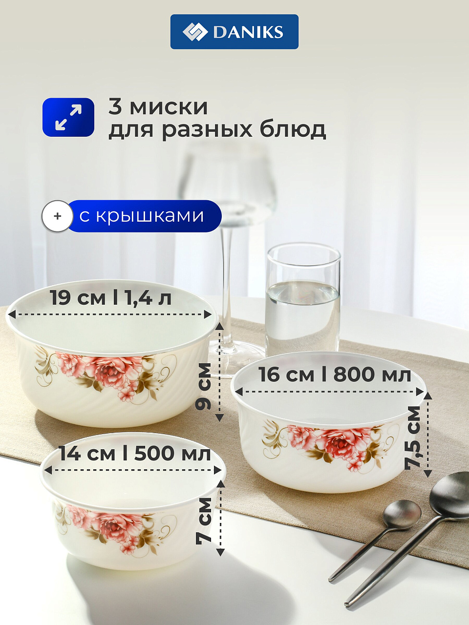 Салатники стеклокерамика Daniks Анжелика: набор из 3 круглых мисок с крышками (0.5, 0.8, 1.4 л) в подарочной упаковке — идеальное решение для сервировки и хранения дома и на даче.