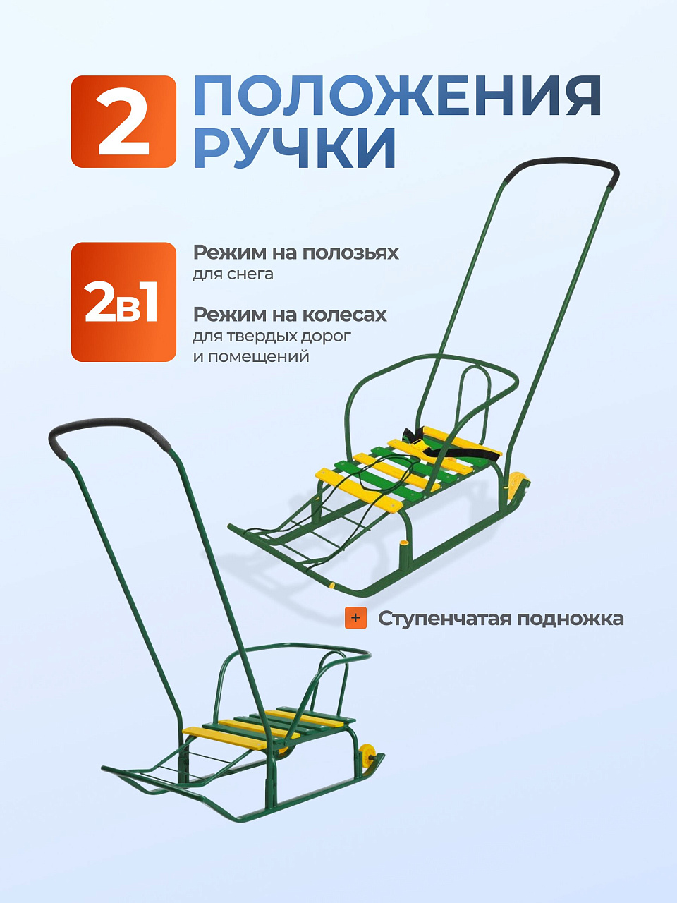 Материал: каркас – металл; сидение – деревянные рейки; ремень безопасности – ременная лента; колеса – морозостойкая пластмасса.