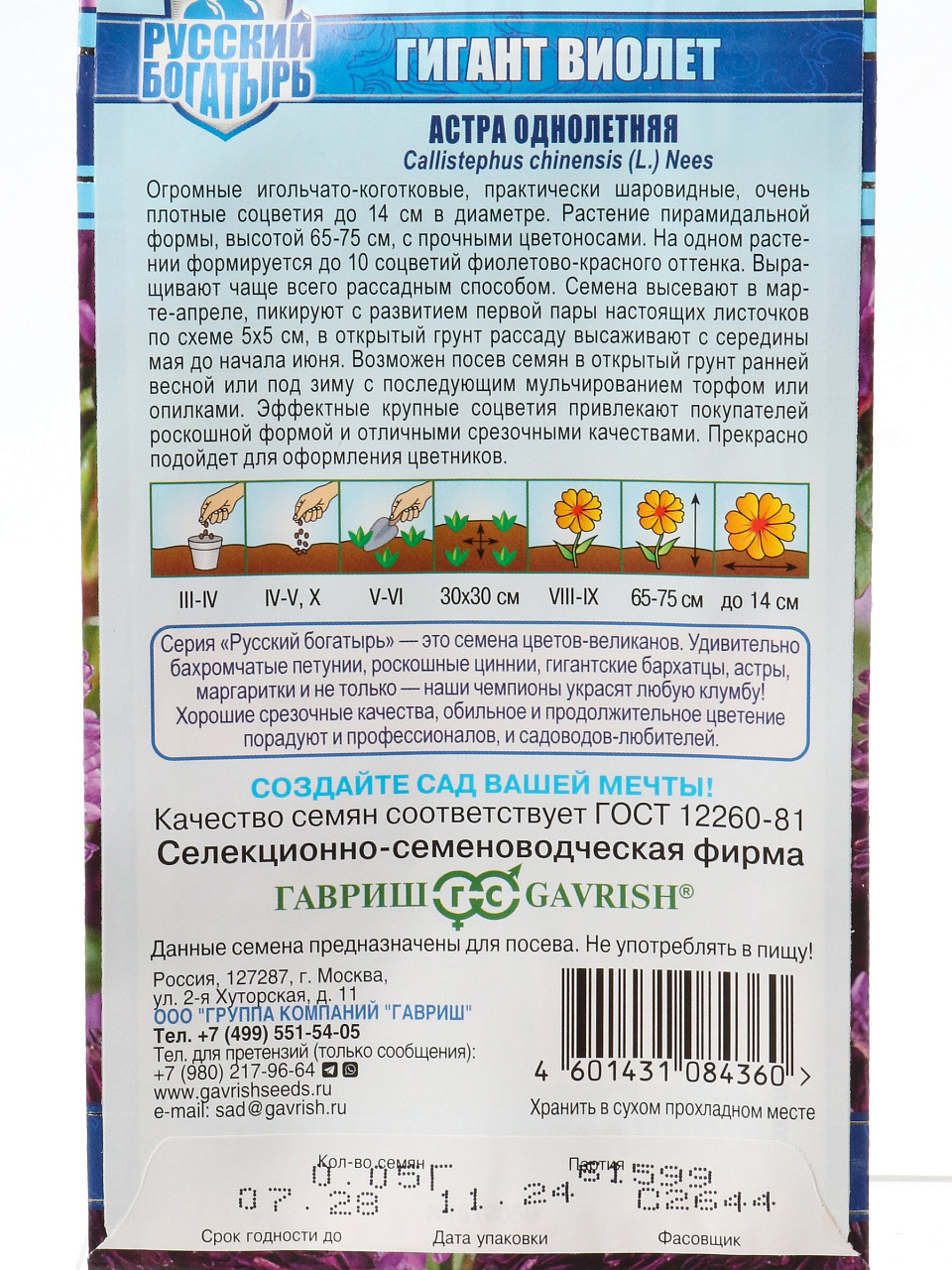 Вы можете приобрести «Семена Цветы, Астра, Гигант виолет, 0.05 г, Русский богатырь, однолетняя, игольчато-коготковая, цветная упаковка, Гавриш» и другие товары в нашем интернет-магазине в Орле по низким ценам и с бесплатным самовывозом.