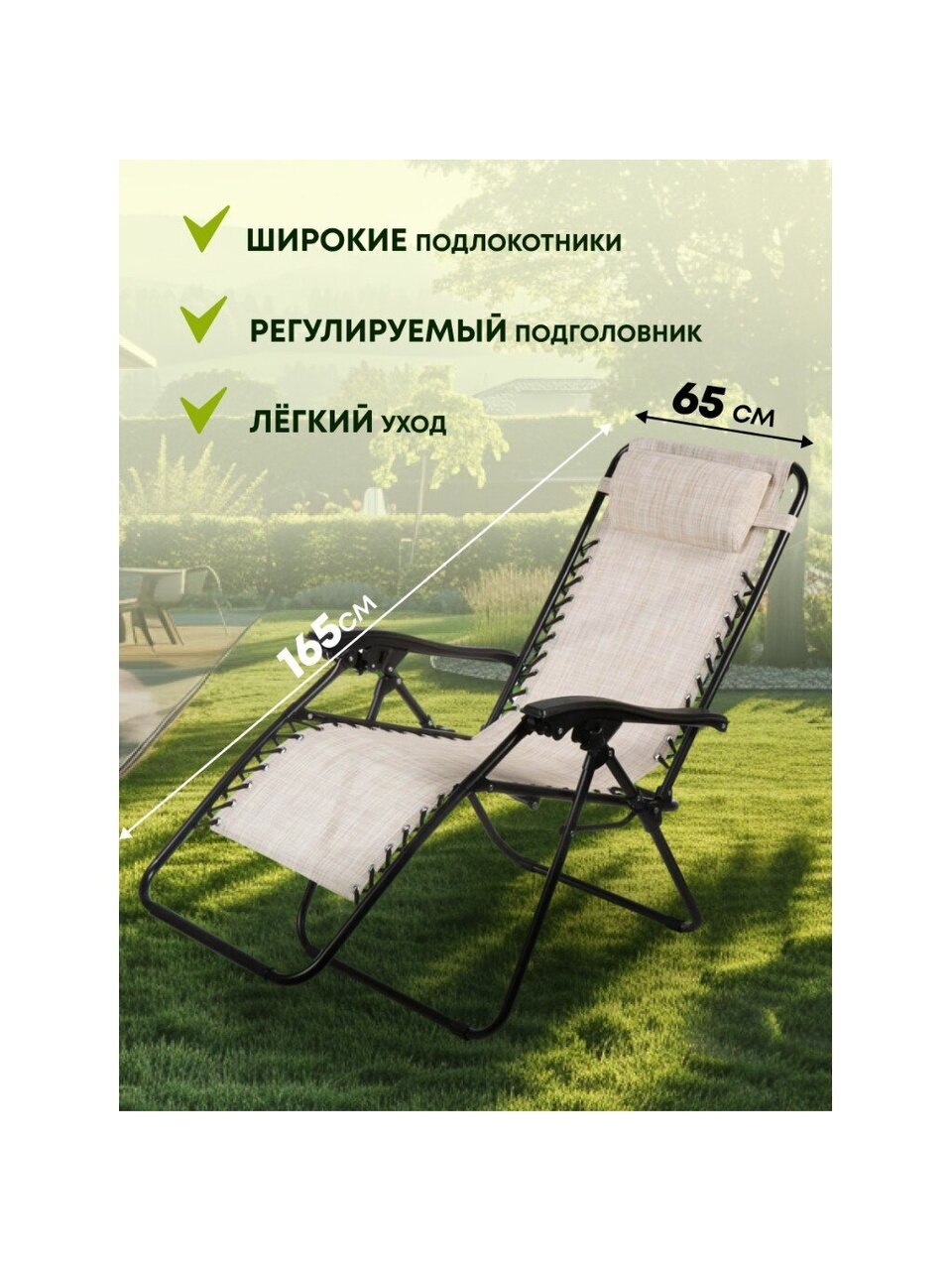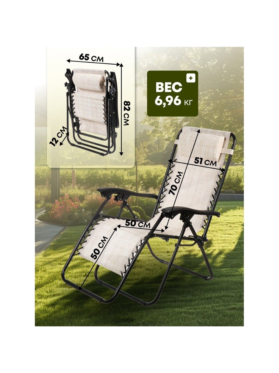 - Благодаря складному механизму шезлонг легко использовать и хранить. Его можно быстро и без усилий сложить, чтобы взять с собой на пляж или в парк.