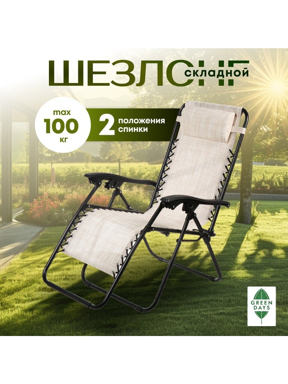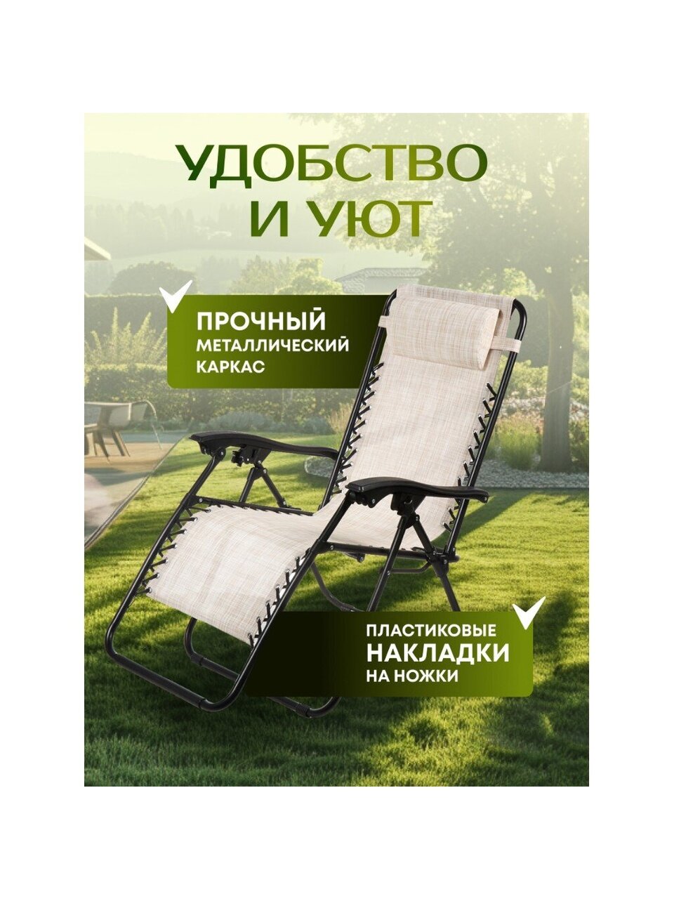 - Шезлонг изготовлен из высококачественных материалов, гарантирующих его надёжность и долгий срок службы.