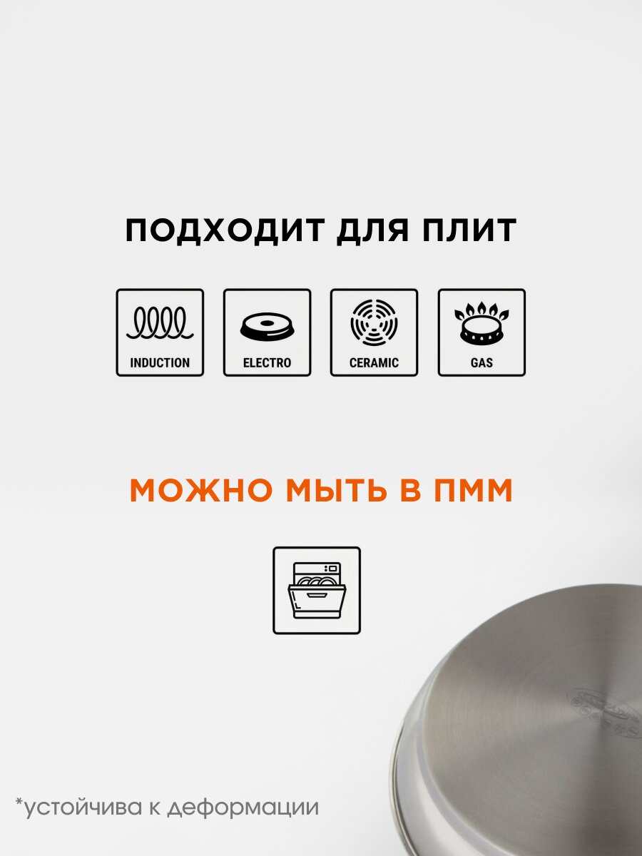 - Увеличенный диаметр 30 см, прочная нержавеющая сталь, толстое дно 3,5 мм — долговечность и равномерный нагрев