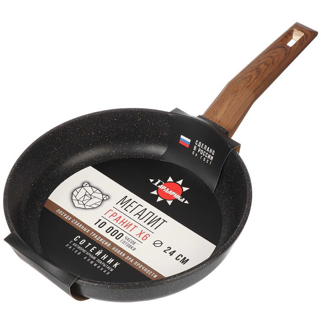 Сковорода из литого алюминия 24 см Гардарика Мегалит 18: долговечное антипригарное покрытие, эргономика soft-touch, идеальна для дома и дачи.