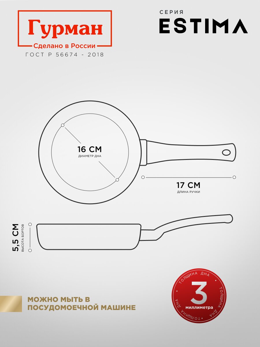 Да, сковорода Гурман Estima подходит для индукционных, газовых, электрических и стеклокерамических плит. Диаметр дна — 16 см, что оптимально для большинства конфорок.