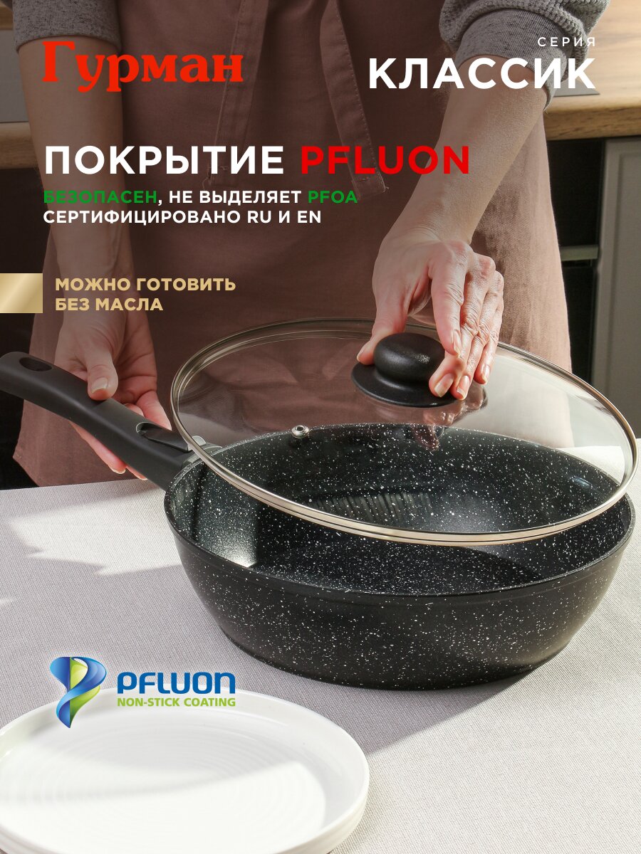 - Толстое дно 3,5 мм и антипригарное покрытие PFLUON — равномерный нагрев, без пригорания, диаметр 28 см.