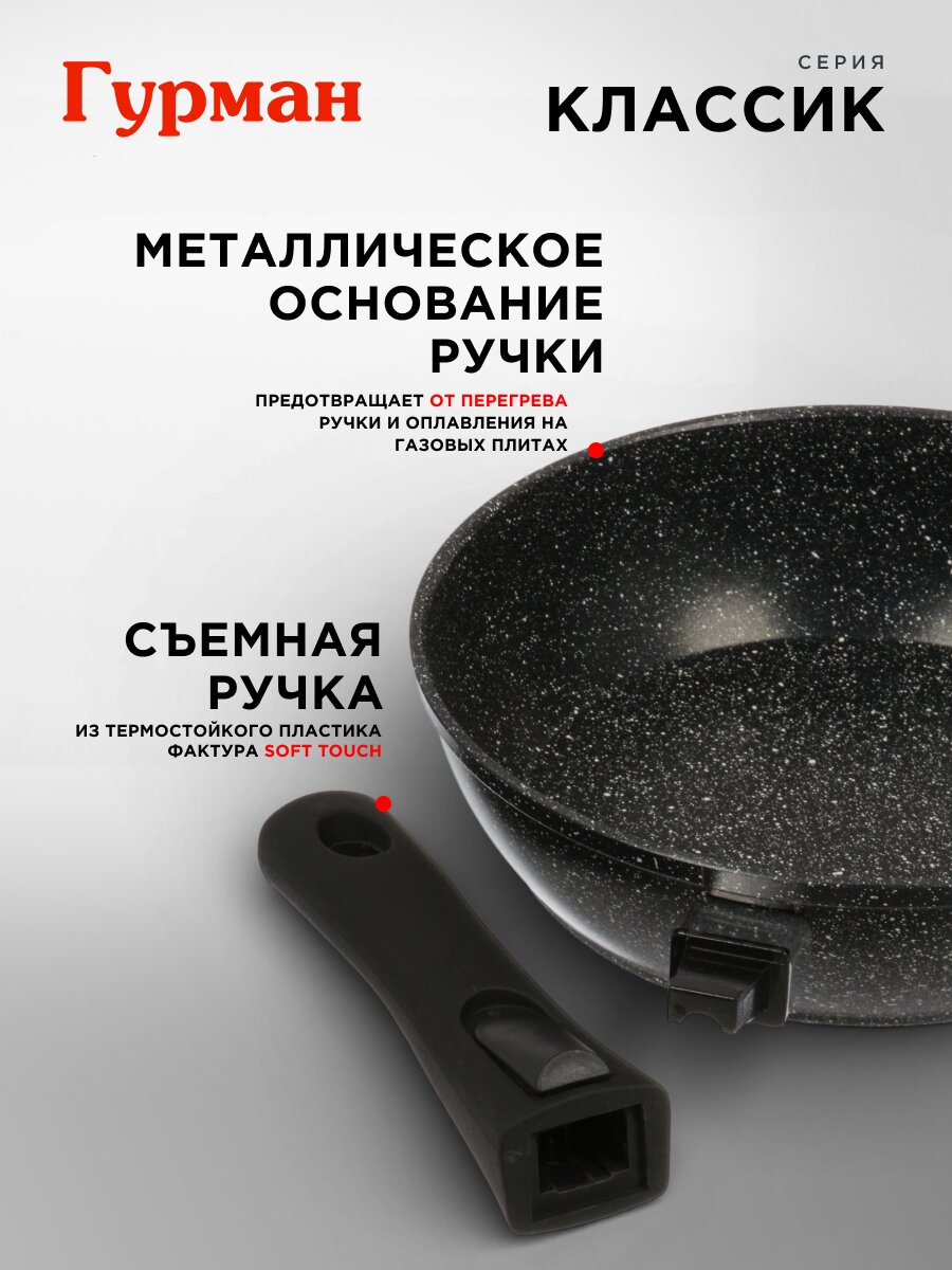 Если вы ищете, какую сковороду выбрать для индукционной плиты или чем отличается алюминиевая сковорода от других видов, обратите внимание на совместимость с разными типами плит: газовые, индукционные, электрические и стеклокерамические. Эта модель оснащена съёмной ручкой, что удобно для хранения и использования в духовке. В комплекте идёт прочная крышка, а гарантия производителя — 36 месяцев. В отличие от аналогов с фиксированной ручкой и без антипригарного покрытия, «Гурман Классик» — это универсальное решение для ежедневной кухни и дачи.
