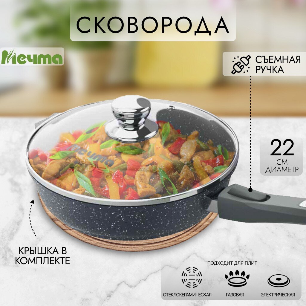 Сковорода литой алюминий 22 см Мечта Гранит black с антипригарным покрытием, крышкой и съемной ручкой — идеальный выбор для кухни, дачи или подарка. Решает вопрос пригорания и экономит время на мытьё.