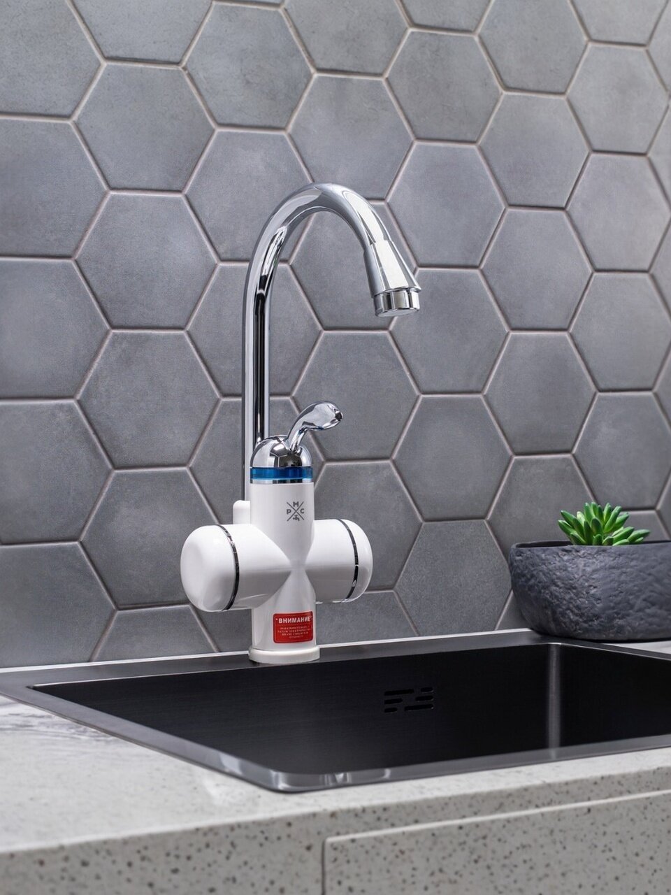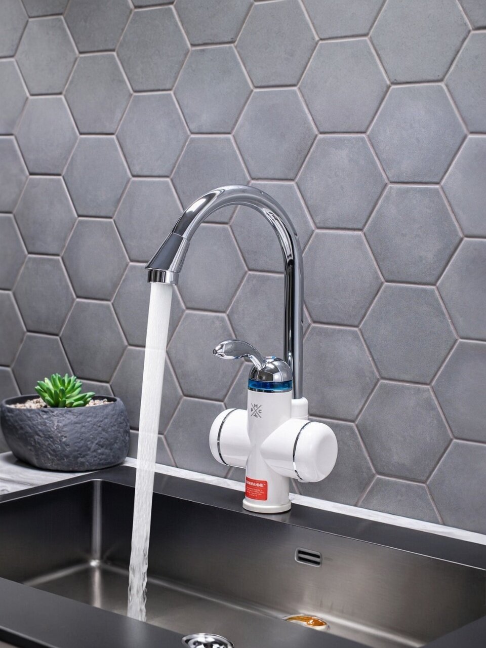 Смеситель для раковины РМС-ЭЛ01 с проточным водонагревателем: экономия воды и электричества, мгновенный нагрев, стильный белый дизайн для кухни и дачи.