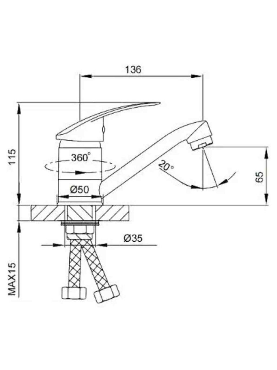Для установки требуется одно отверстие диаметром 35 мм, стандарт подводки — 1/2". Монтаж осуществляется гайкой, что удобно для самостоятельной установки.