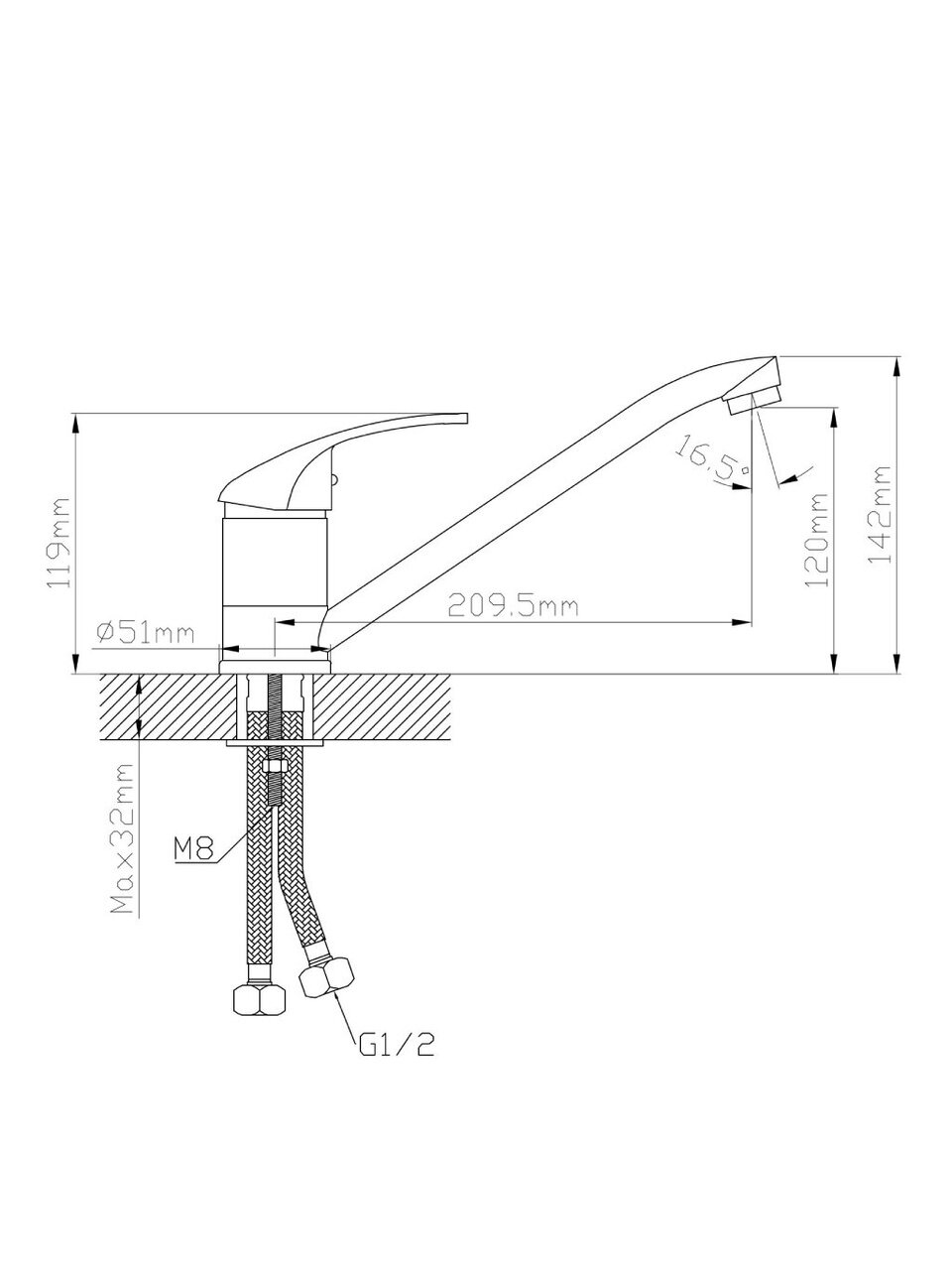 Если вы ищете, какой смеситель удобнее для дома или дачи, обратите внимание на оптимальные размеры: средний излив (20,9 см), высота 12 см — удобно мыть посуду, наполнять кастрюли, не разбрызгивая воду. Монтаж — горизонтальный, крепление на гайку, диаметр монтажного отверстия — 35 мм. Модель совместима с большинством кухонных моек российского и европейского стандарта.