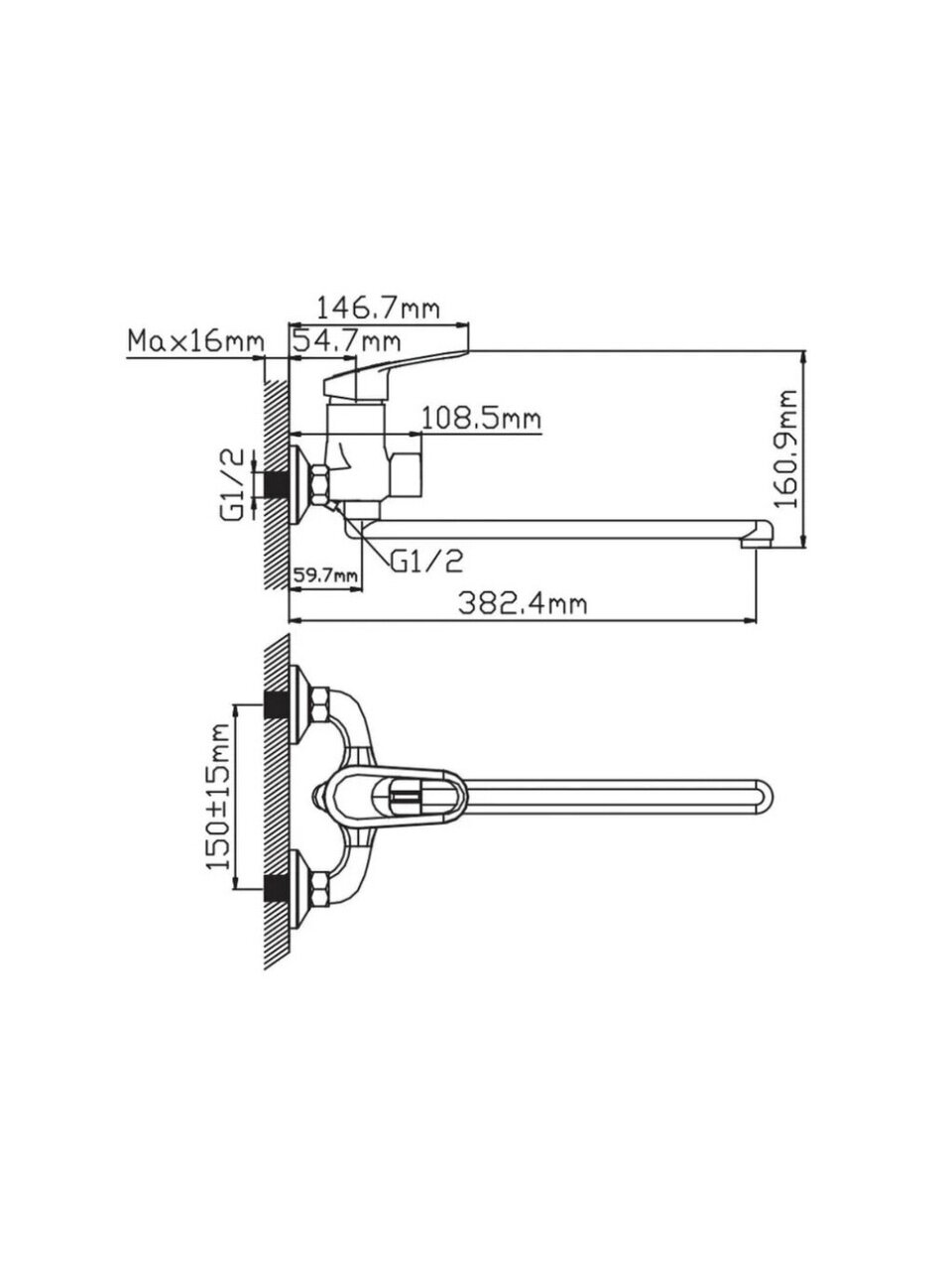 Смеситель предназначен для настенного вертикального монтажа на 2 отверстия с межосевым расстоянием 150 мм, подходит для стандартной подводки 1/2".