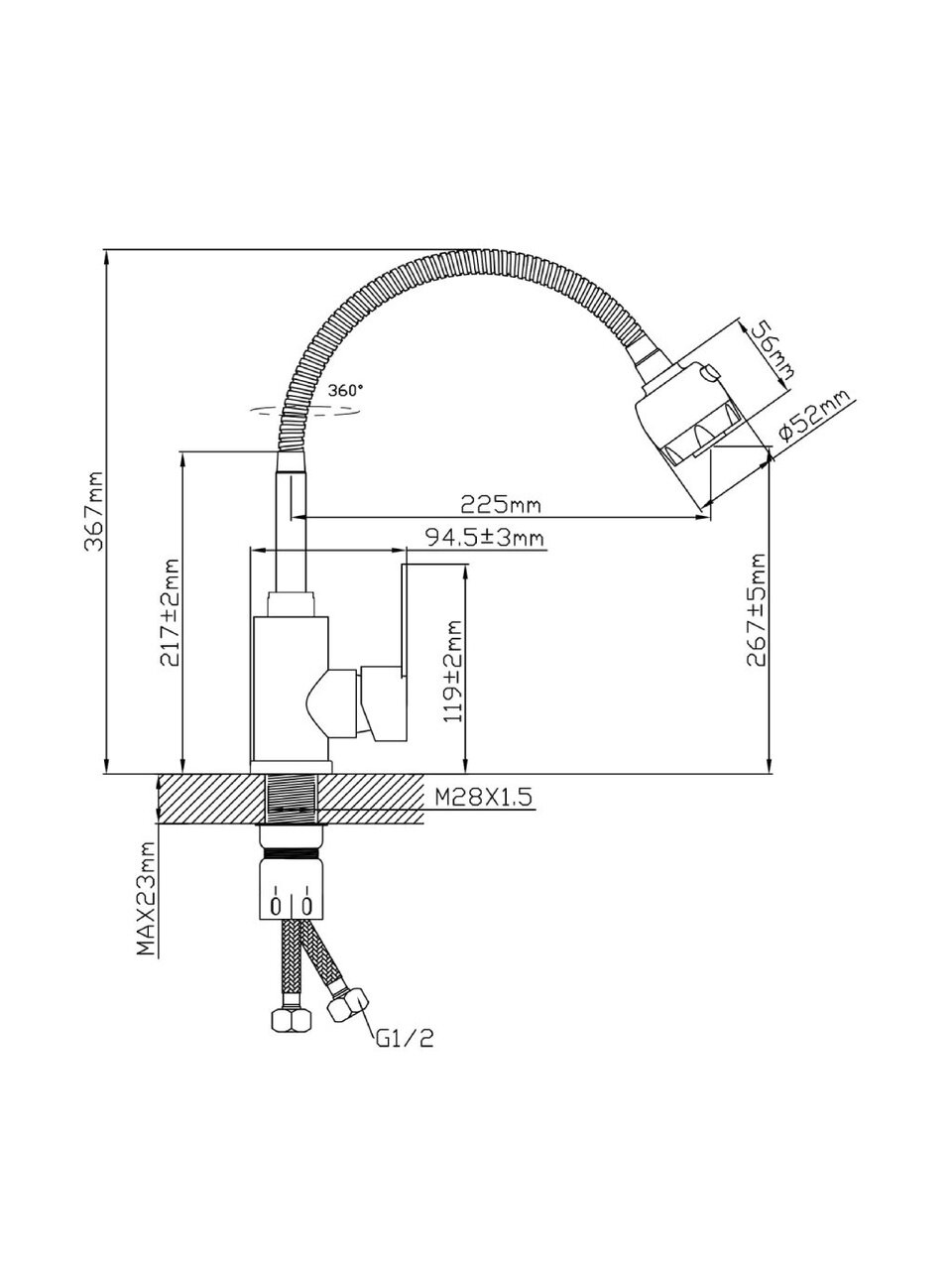 - Гибкий излив 35 см — легко направлять поток воды, удобно мыть крупную посуду и наполнять высокие ёмкости
