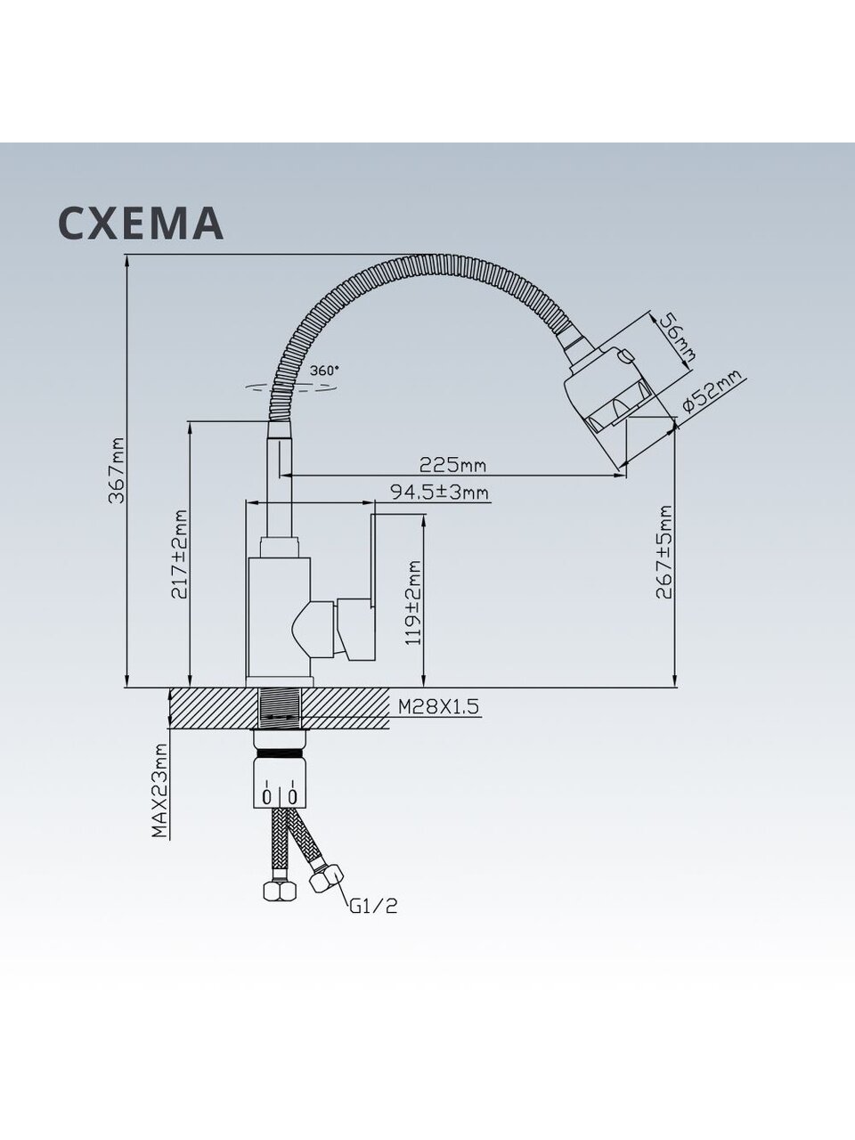 Для установки требуется одно отверстие диаметром 45 мм. Крепление осуществляется с помощью гайки, что обеспечивает надёжную фиксацию на кухонной мойке или столешнице.