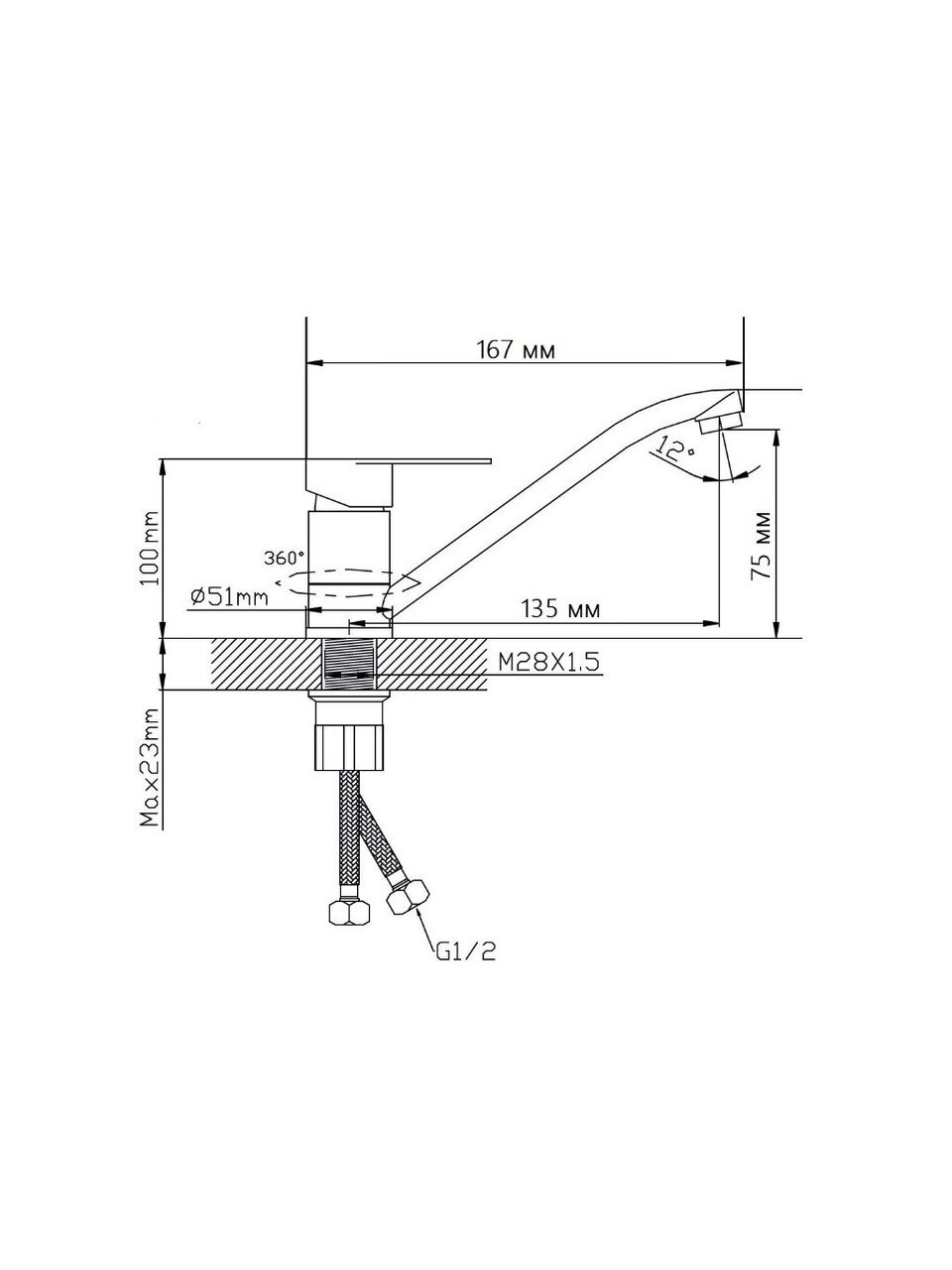Да, смеситель универсален: подходит для раковин на кухне и в ванной, монтируется в одно отверстие диаметром 35 мм, подключается через стандартный шланг 1/2".