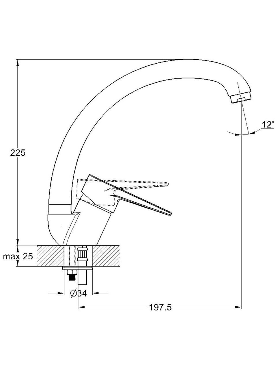 Для установки потребуется одно отверстие диаметром 34 мм. Стандарт подводки шланга — 1/2 дюйма, что подходит для большинства кухонных коммуникаций.