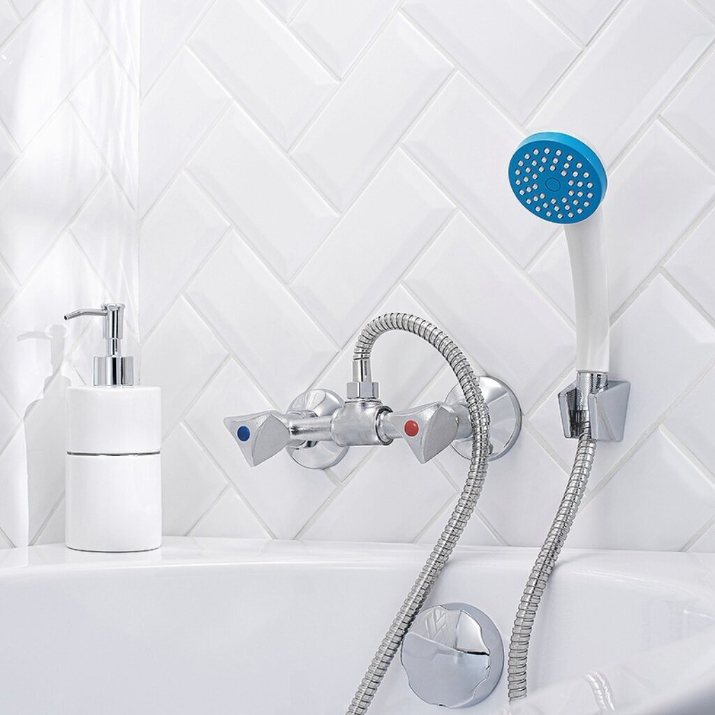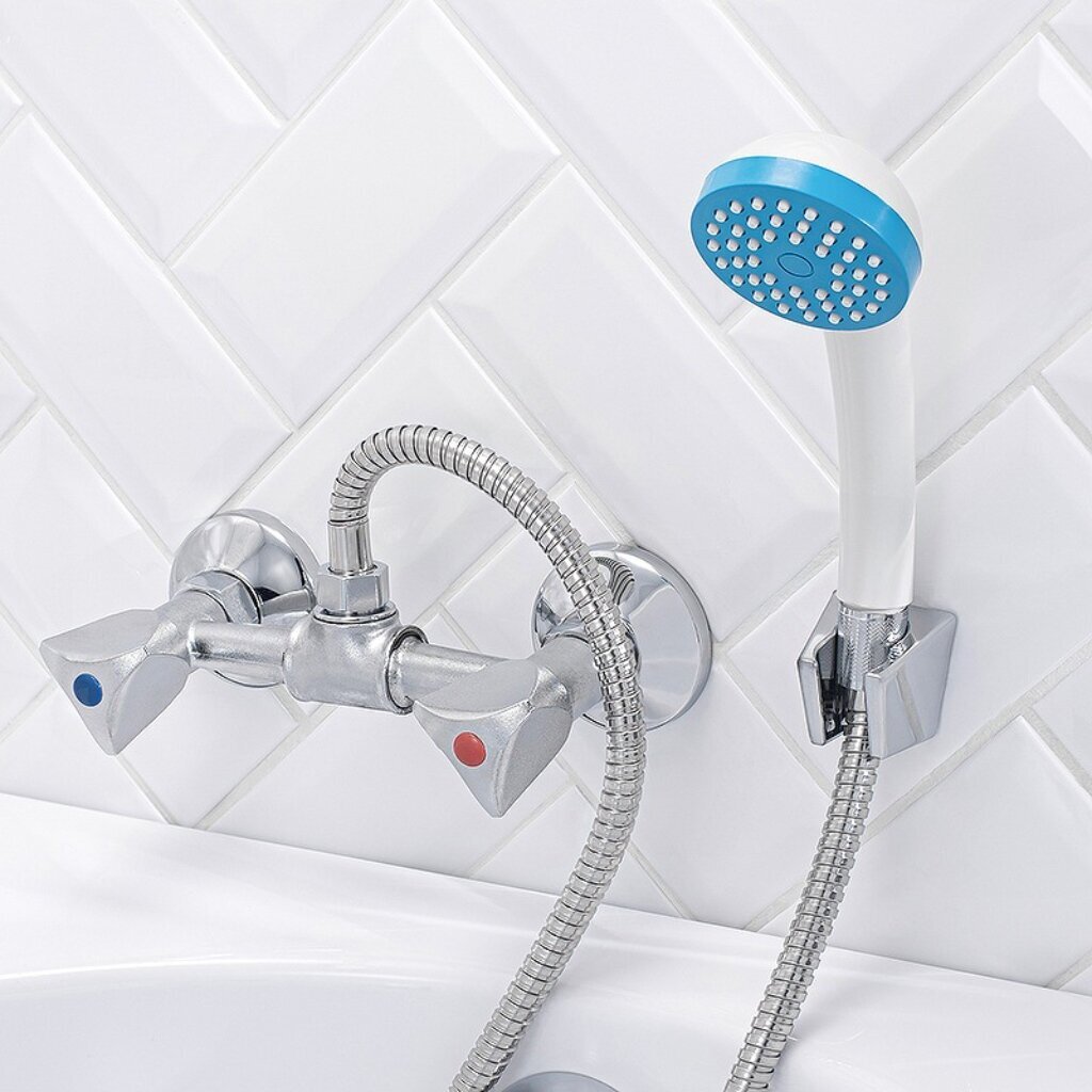 Смеситель оснащён двухвентильным поворотным управлением и рассчитан на стандартное межосевое расстояние 150 мм, что подходит для большинства душевых систем с настенным креплением.