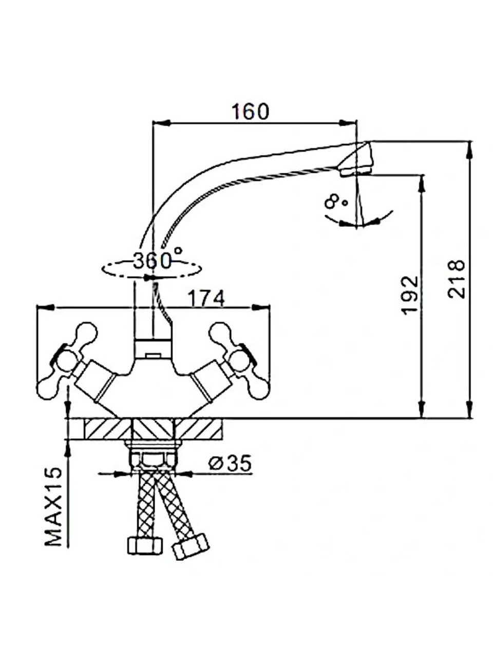 Высота излива — 19,2 см, длина — 16 см. Средний высокий излив удобен для мытья посуды и наполнения высоких ёмкостей, а поворотная конструкция облегчает доступ к разным частям мойки.