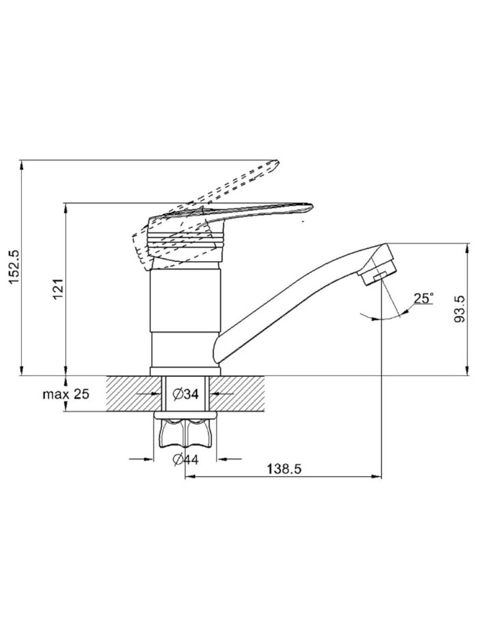 Для монтажа требуется одно отверстие диаметром 34 мм. Крепление осуществляется гайкой, стандарт подключения шланга — 1/2".